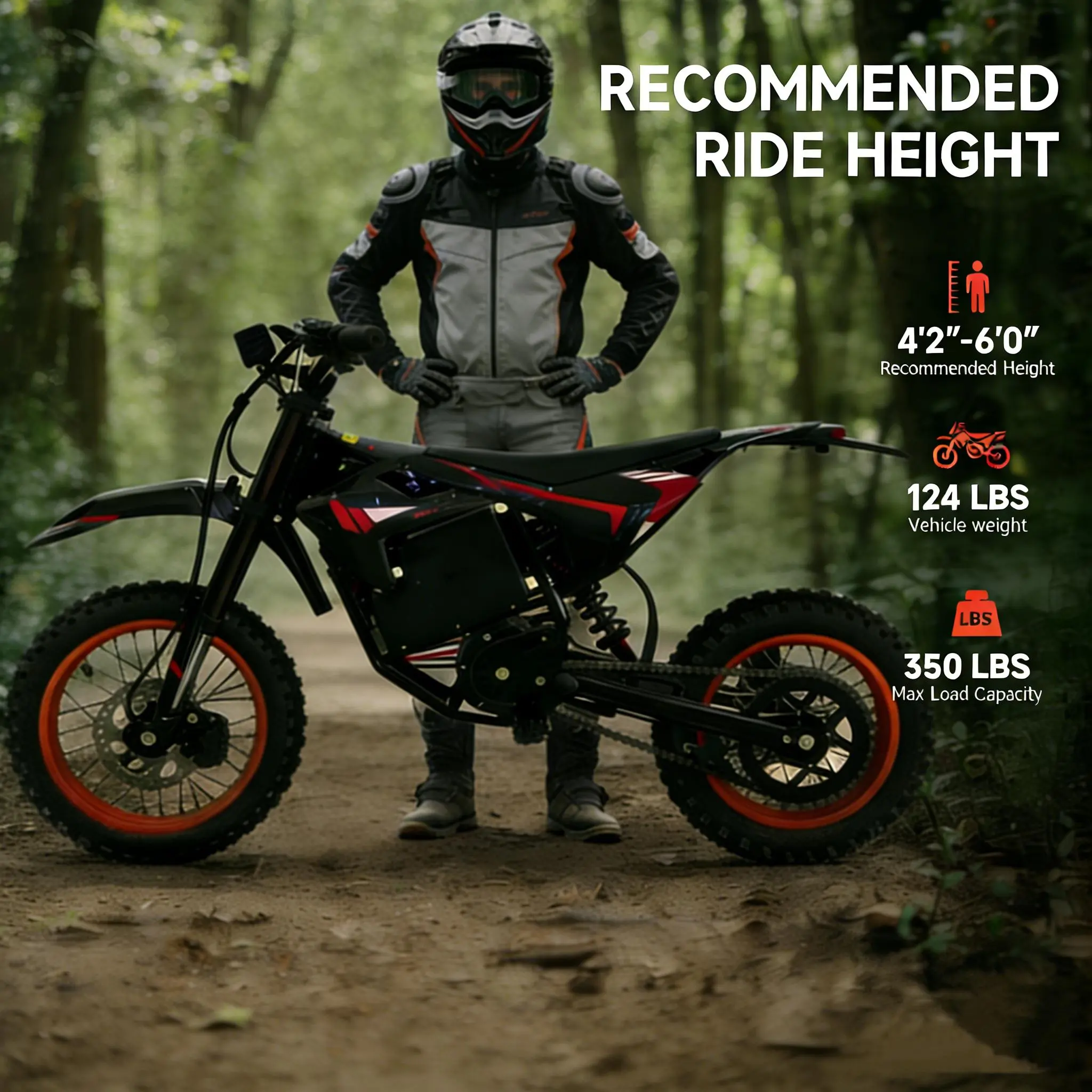 #Sa se yon moto elektrik off-road ki fèt pou monte sou tè difisil tankou sab, wòch, oswa chemen mòn. Li gen yon design espòtif nwa ak zoranj ki fè li parèt modèn ak agresif. Karakteristik prensipal yo 	•	⚡ Vitès maksimòm: anviwon 50 MPH (apeprè 80 km/h). 	•	🔋 Distans batri: ka rive jiska 60 mil sou yon chaj. 	•	⚙️ 3 mòd vitès / throttle mode pou kontwole akselerasyon an. 	•	🛞 Kawotchou off-road 14”/12” ki bay bon priz sou tè difisil. 	•	🪵 Double sispansyon (devan ak dèyè) pou absòbe chòk sou move wout. 	•	🛑 Fren idwolik doub pou frenaj ki pi fò ak sekirite. Avantaj 	•	Bon pou chemen mòn, sab, oswa trail. 	•	Silansye paske li elektrik. 	•	Pi lejè pase moto gaz. 	•	Apwopriye pou gran moun ak jèn ki renmen avanti. 💰 Pri: anviwon $999.99 (50% rabè sou pri $1,999.98) ak livrezon gratis. ✅ An rezime: Se yon moto elektrik ki fèt pou plezi ak avantur off-road, ak bon vitès, bon sispansyon, ak kawotchou solid pou tè difisil.