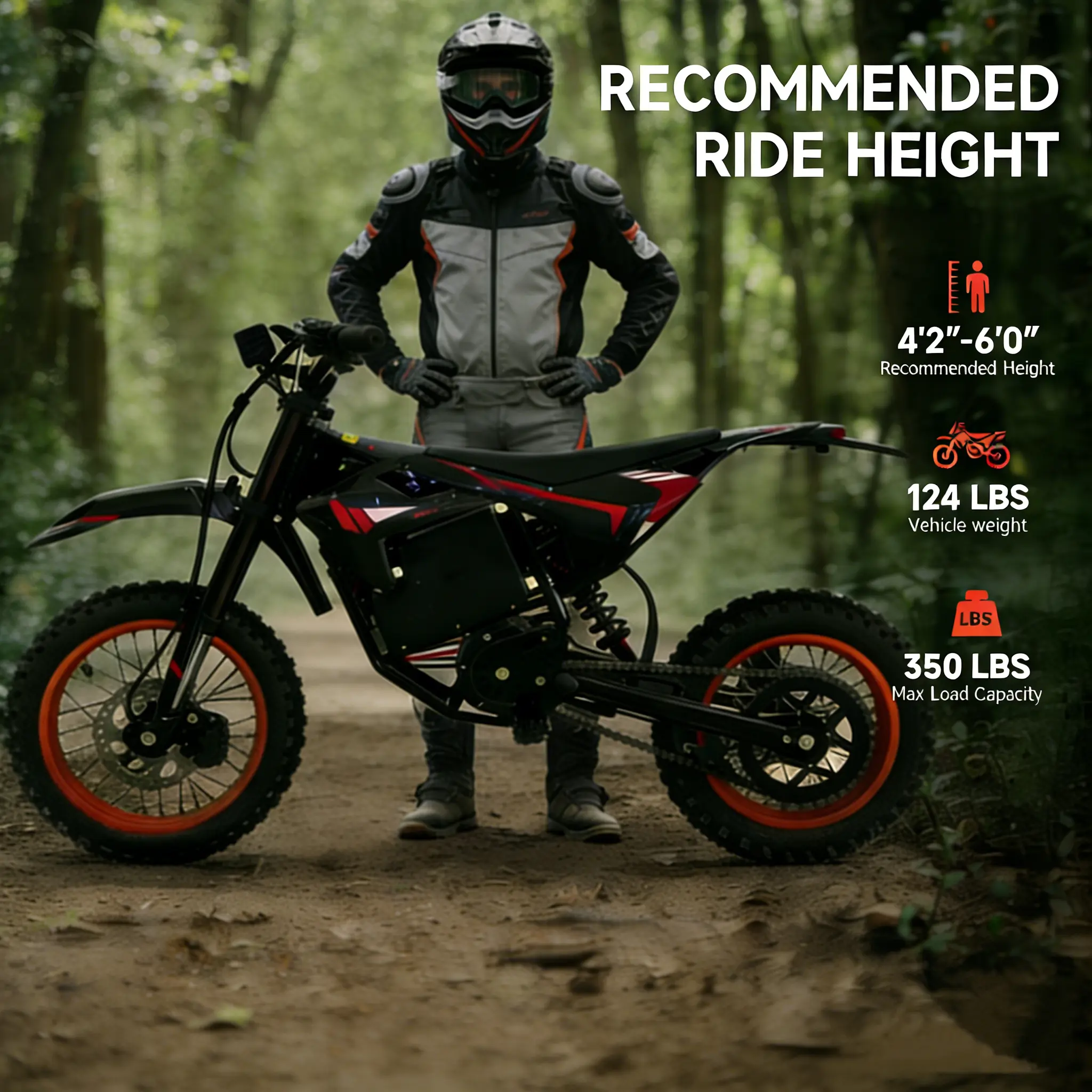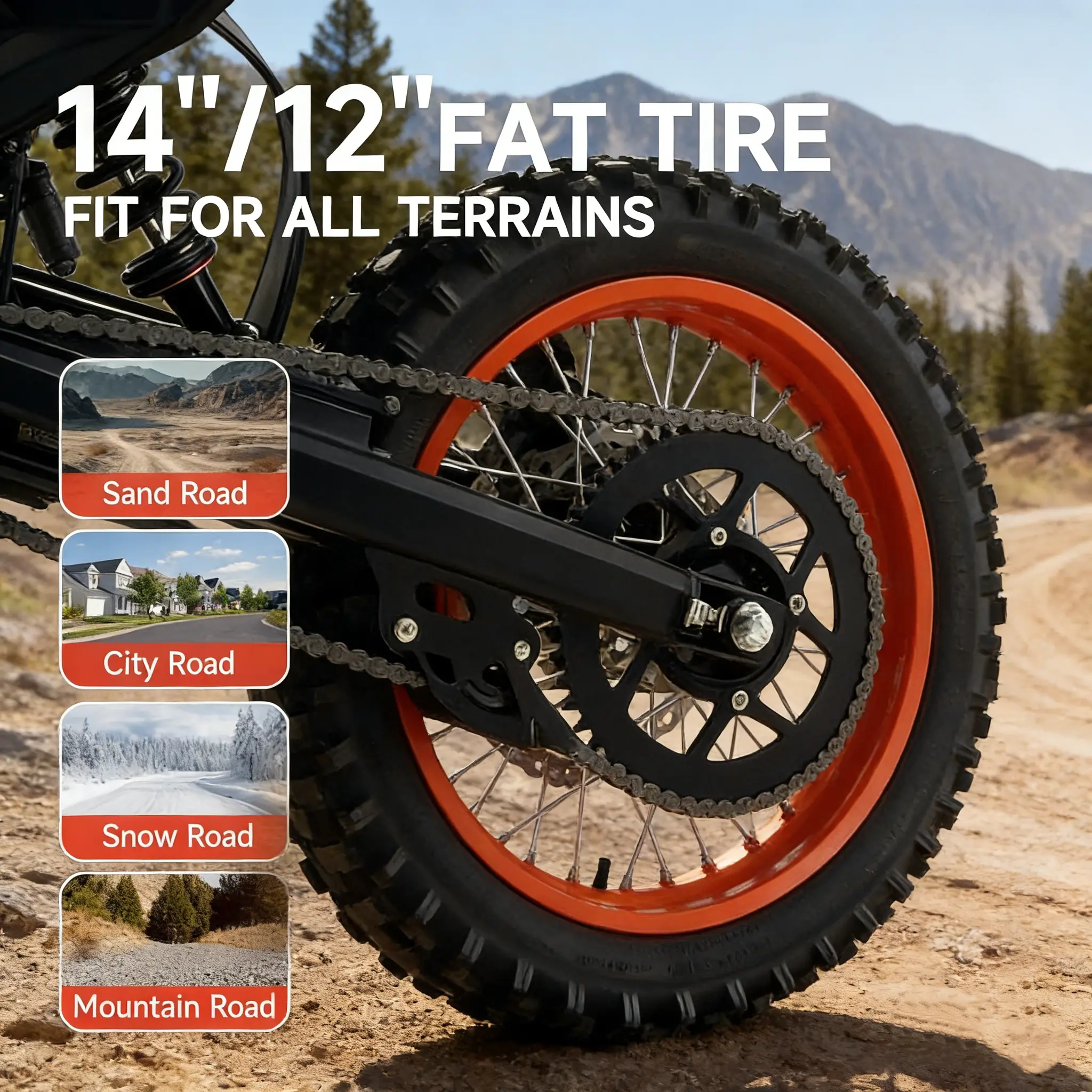 14'' front and 12'' rear fat tires provide superior grip on sand, city roads, snow, and mountain trails, with a 350 lbs max load capacity and a lightweight 124 lbs frame for versatile, all-terrain use.