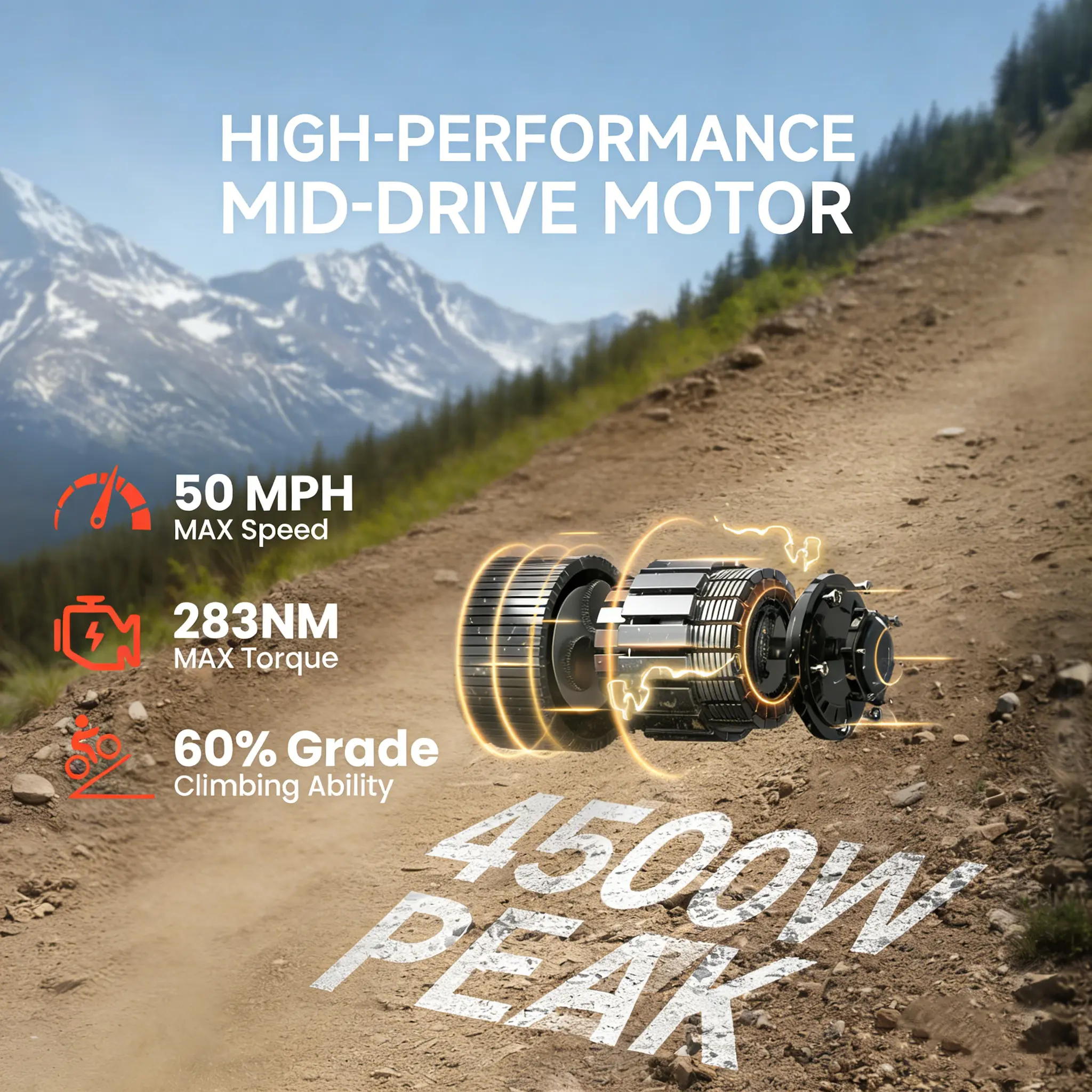 Powered by a 4500W peak mid-drive motor, this off-road e-ride delivers 283NM max torque and a 50 MPH top speed, with a 60% grade climbing ability for tackling steep trails and rough terrain.
