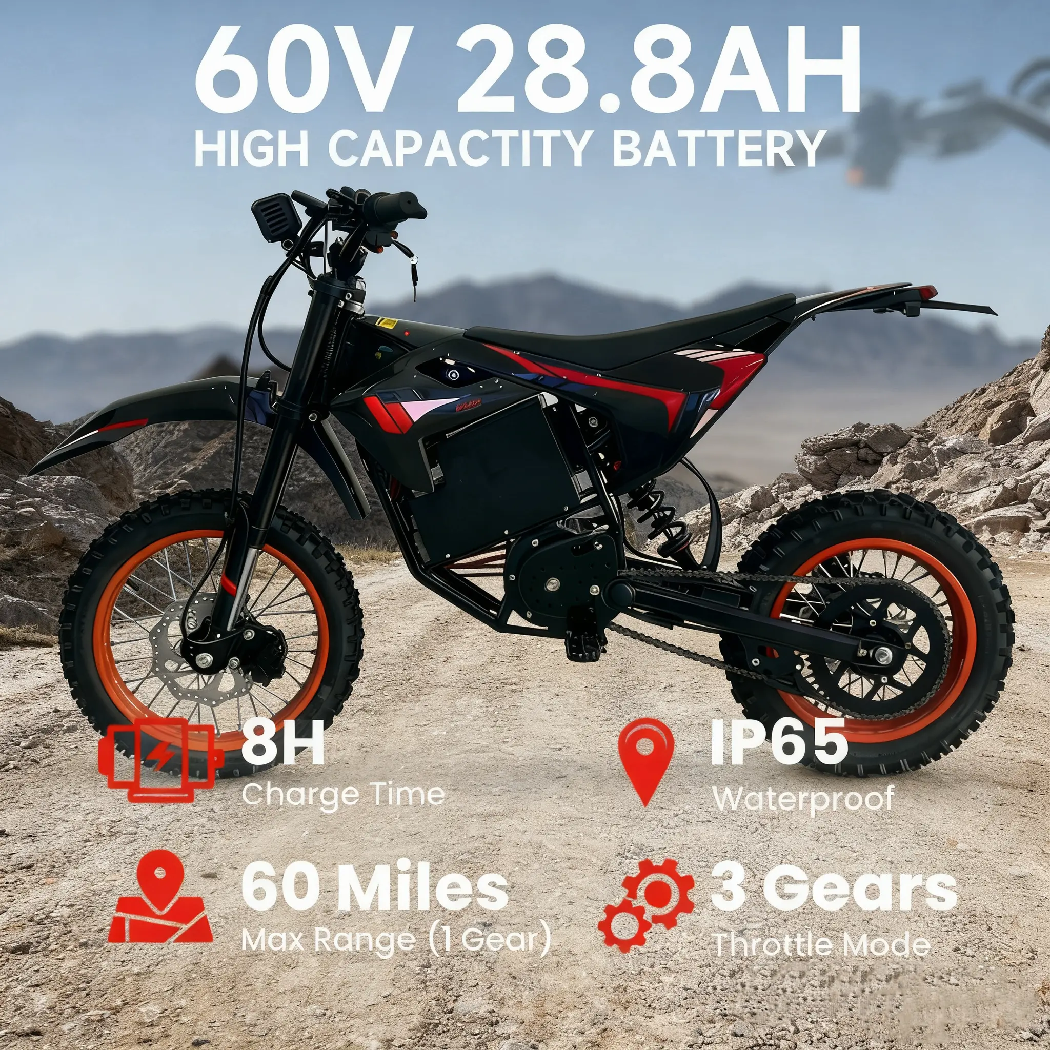 The 60V 28.8Ah battery provides a 60-mile max range (1st gear), with an 8-hour charge time and IP65 waterproof rating, plus 3 adjustable throttle modes for all-weather, long-lasting adventures.