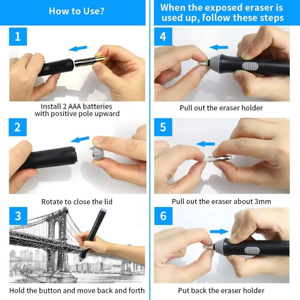 This electric eraser is powered by 2 × AAA battery. Providing a cordless convenience. Ready for use anytime, anywhere. (Batteries are not included)