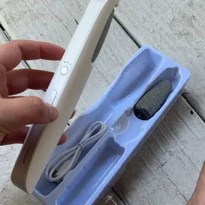 Select the appropriate roller head and speed to start using, gently glide it over your calloused feet, carefully repeating 1 to 3 times.