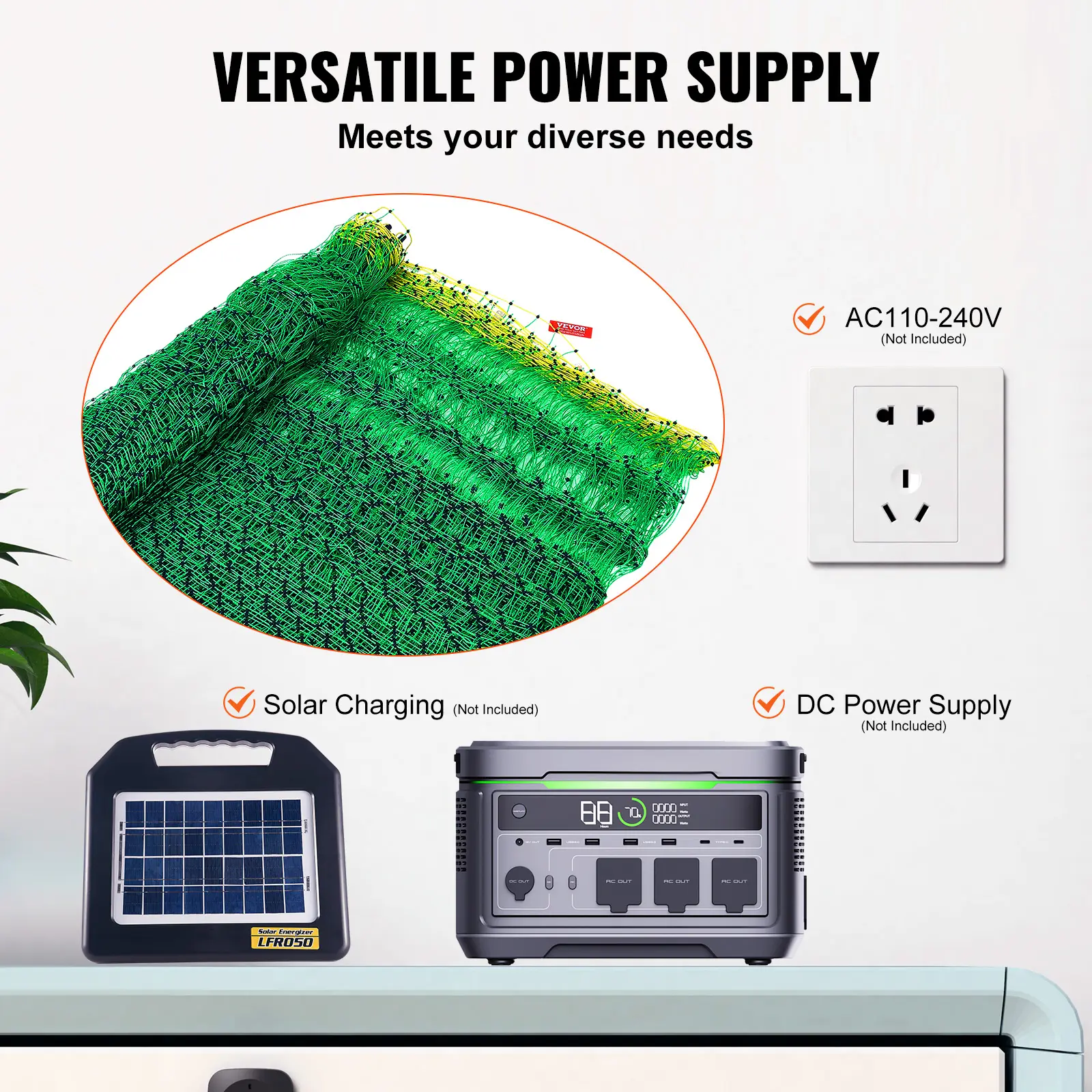 • Multiple Power Supply Options: This electric fence supports external power supply of AC110-240V, as well as solar panels and DC power supply (not included). These multiple power supply options reduce energy consumption and provide a green solution for your farm.
