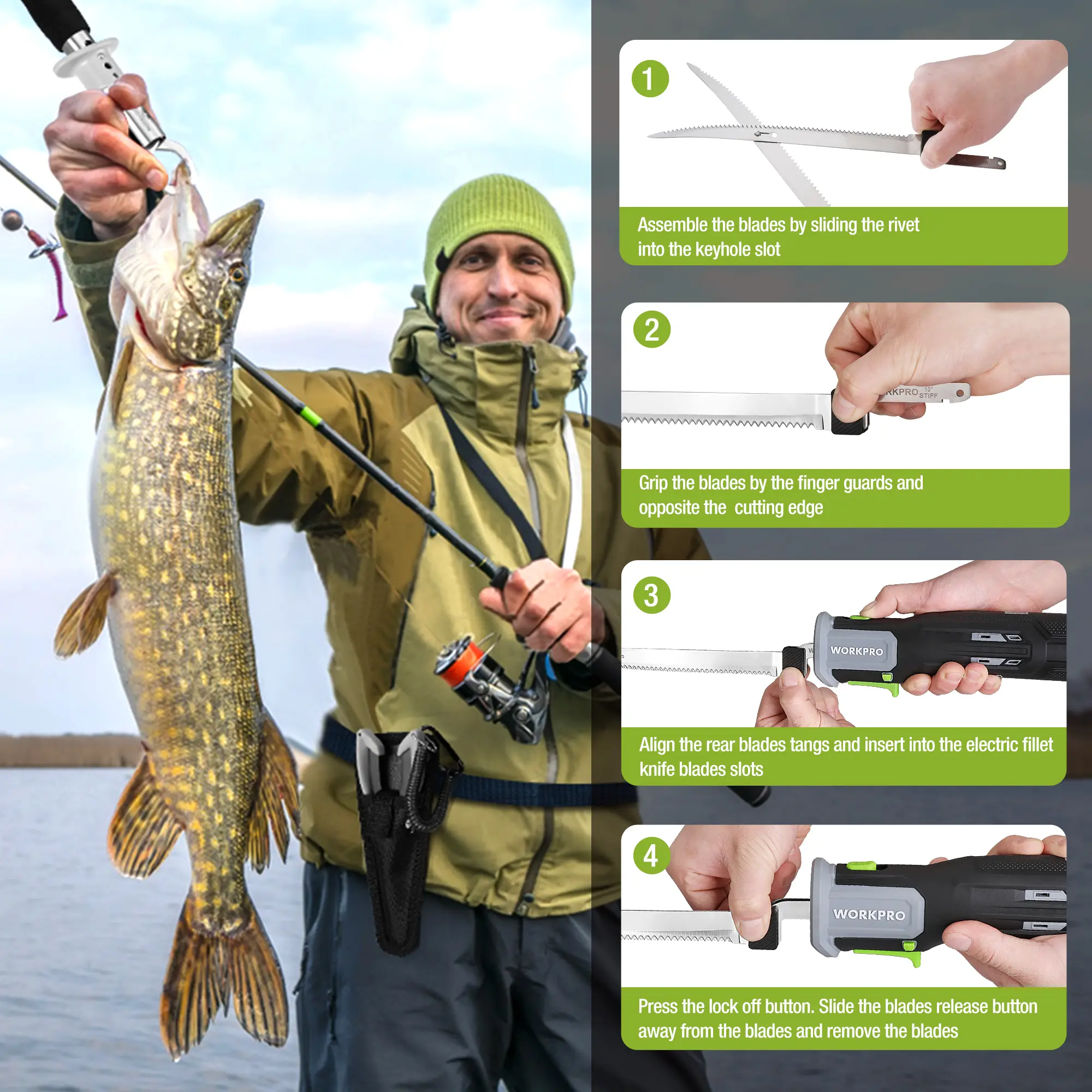 ·Interchangeable Razor-Sharp Blades - The cordless fish fillet knife is furnished with two sizes of reciprocating razor blades: an 8" flex blade and a 10" stiff blade. Crafted from premium carbon stainless steel, these blades are not only sharp but also highly strong, catering to a wide range of fish species such as snapper, cod, flounder, tuna, swordfish, halibut, salmon, and ocean perch.