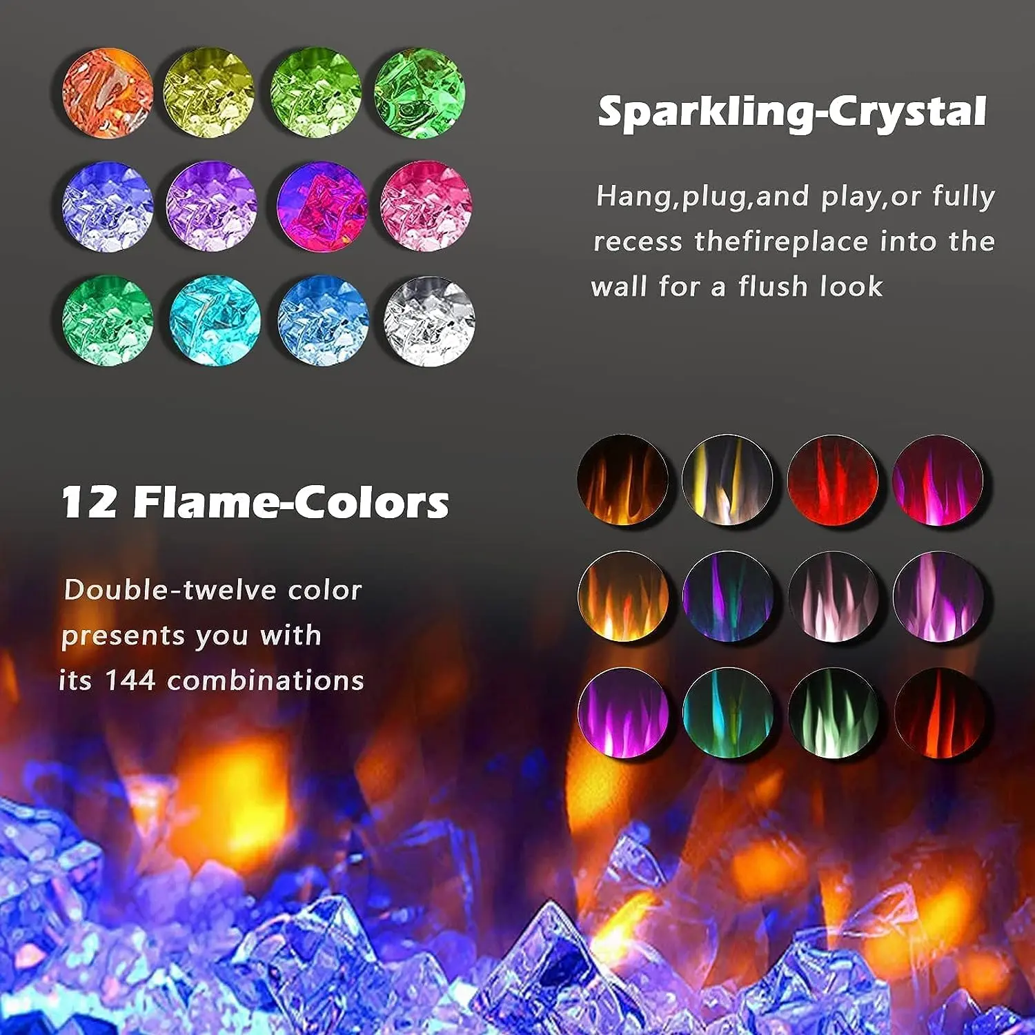 ·Big on capability: Full spectrum LED colors,12 flame and LED flame bed color modes; 5 flame speed modes;5 flame brightness levels,specially automatic flame design. Come with crystal glass stone, realistic flame will offer a true-to-life fire experience