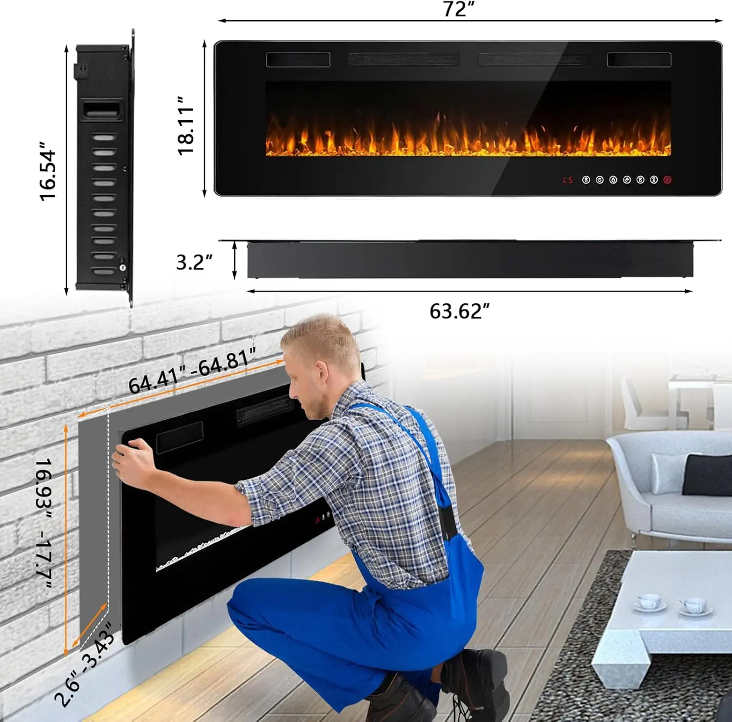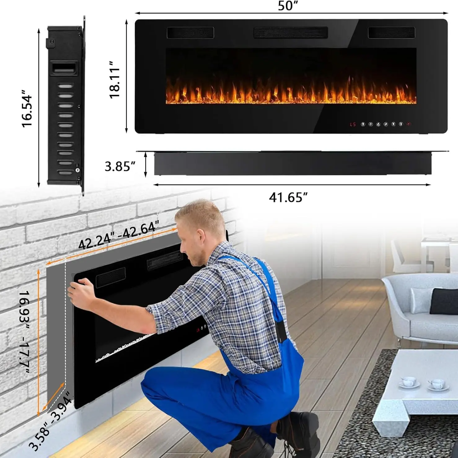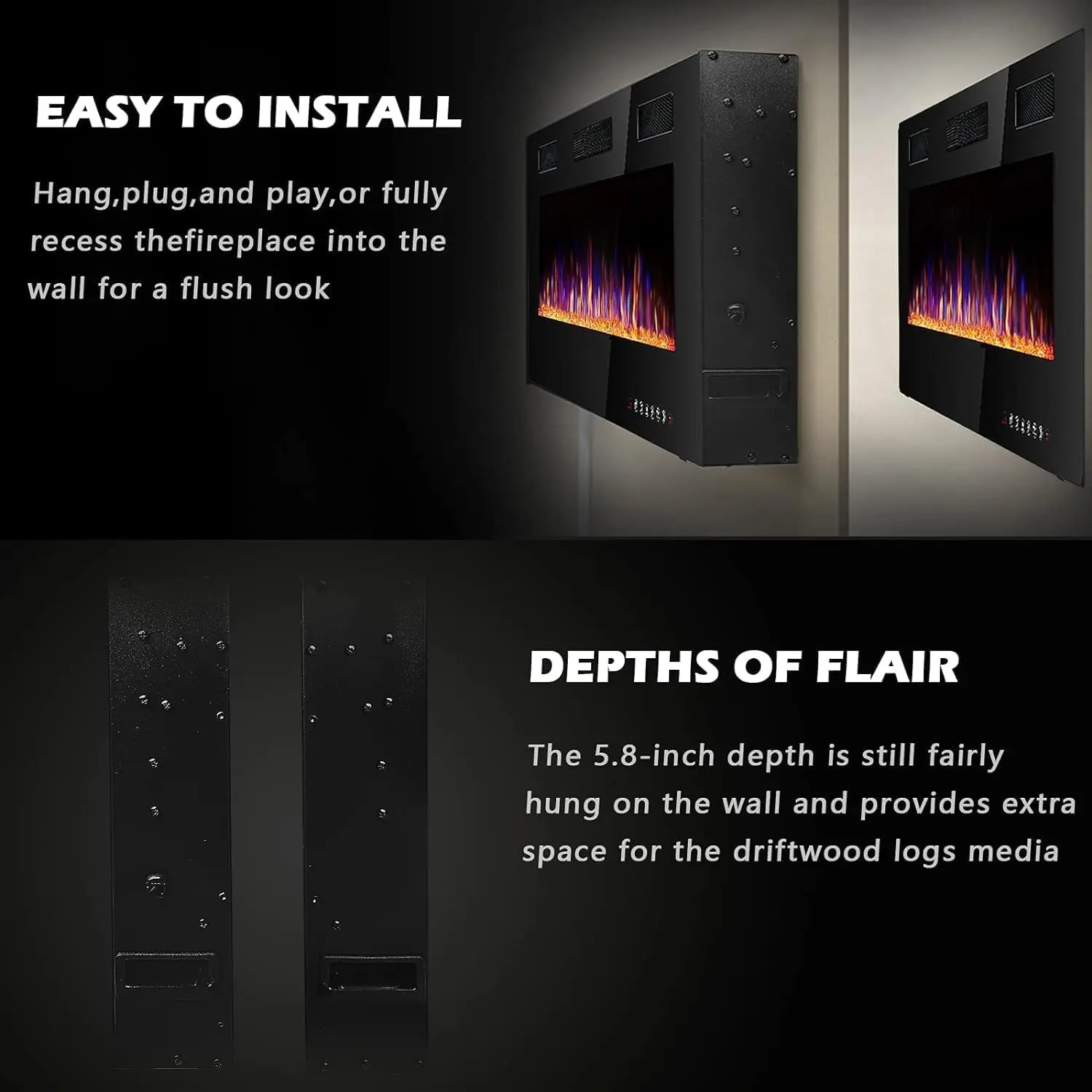 ·Thin in thickness: electric fireplace features a thin, pratical and light design. At 3.85 inches thickness, black linear frame,tempered glass with front air outlet., it’s a sleek contemporary fireplace perfectly fit for your living room,entertainment center and bedroom