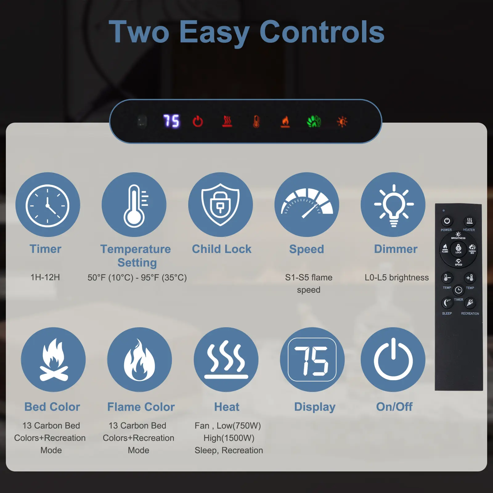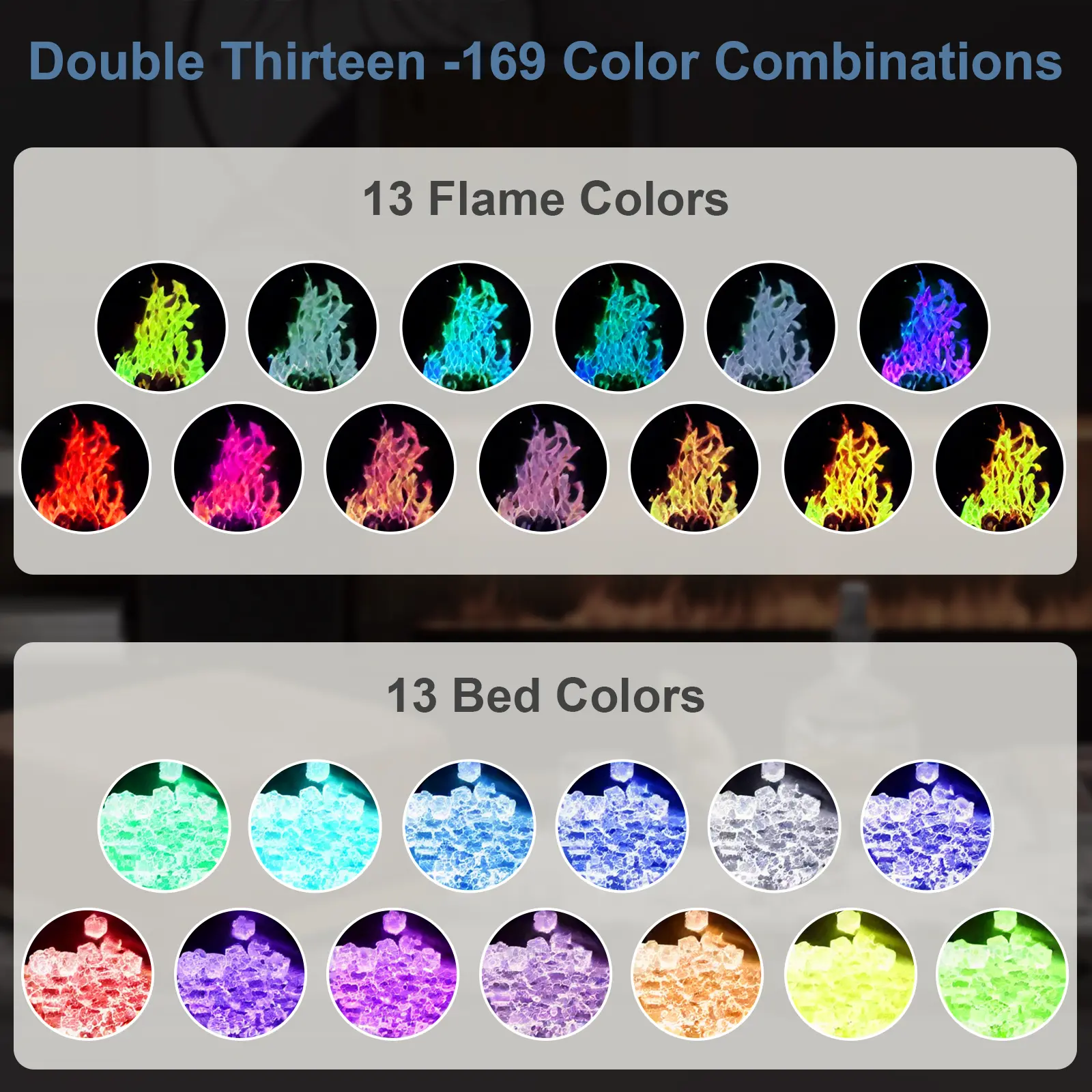 ·Multi Operation Modes: Touch screen and remote control;12 flame & LED flame bed color modes;5 flame speed modes;5 flame brightness levels; Specially automatic flame design(the flame color and brightness changed