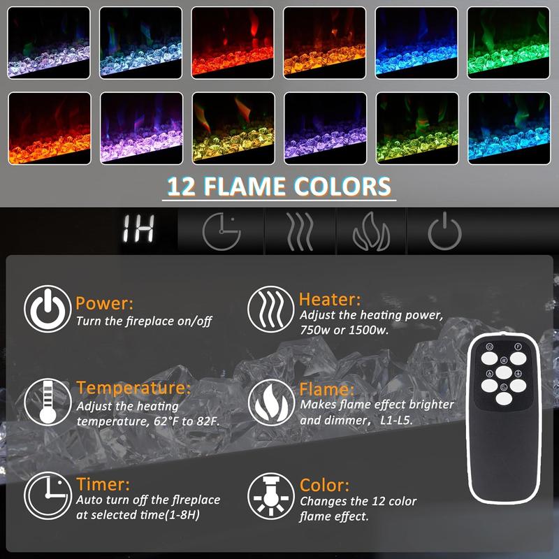 ·192 Lighting combination & Easily Control - 36/64 inches modern wide electric fireplace features 12 changeable realistic flame color& 5 levels dimmer. LED kit included 16 changeable colors and a total 192 kinds of color combinations to customize space and atmosphere. TV cabinets and fireplaces are equipped with remote controls to control the lighting changes remotely