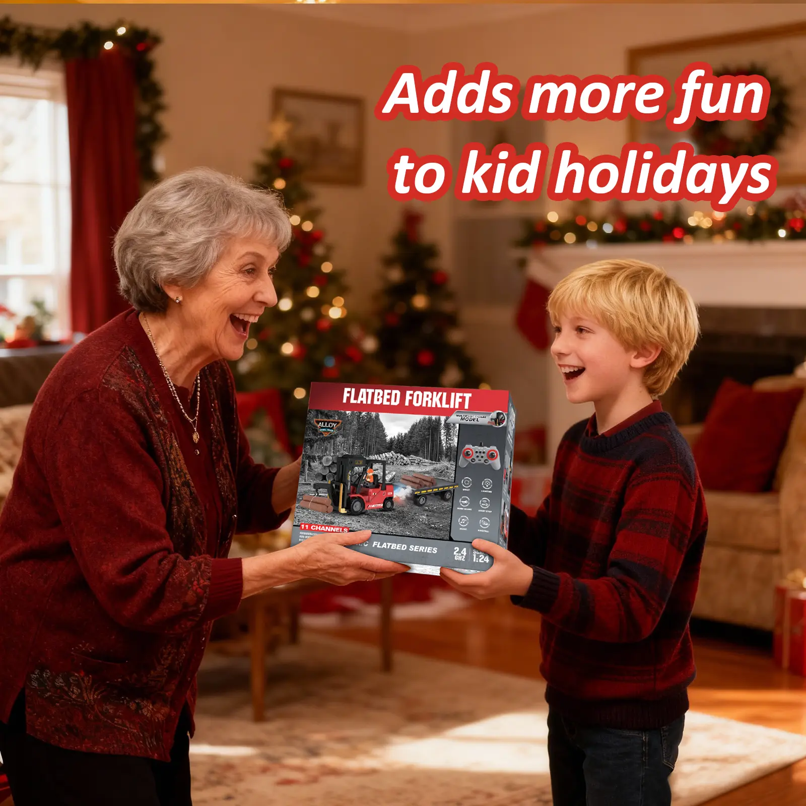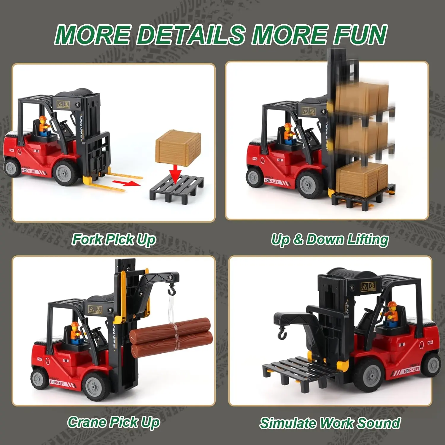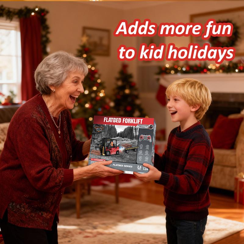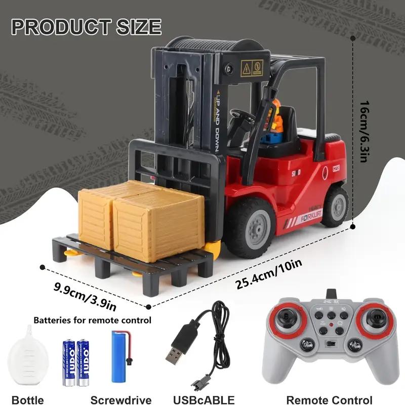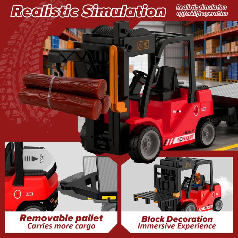 This 2-in-1 convertible forklift toy features a flatbed truck. It includes a rechargeable battery and water spray function. Perfect for stress relief and a Christmas holiday gift. Ideal for ages 3+ and future warehouse keepers. Enhance RC modeling with realistic play.