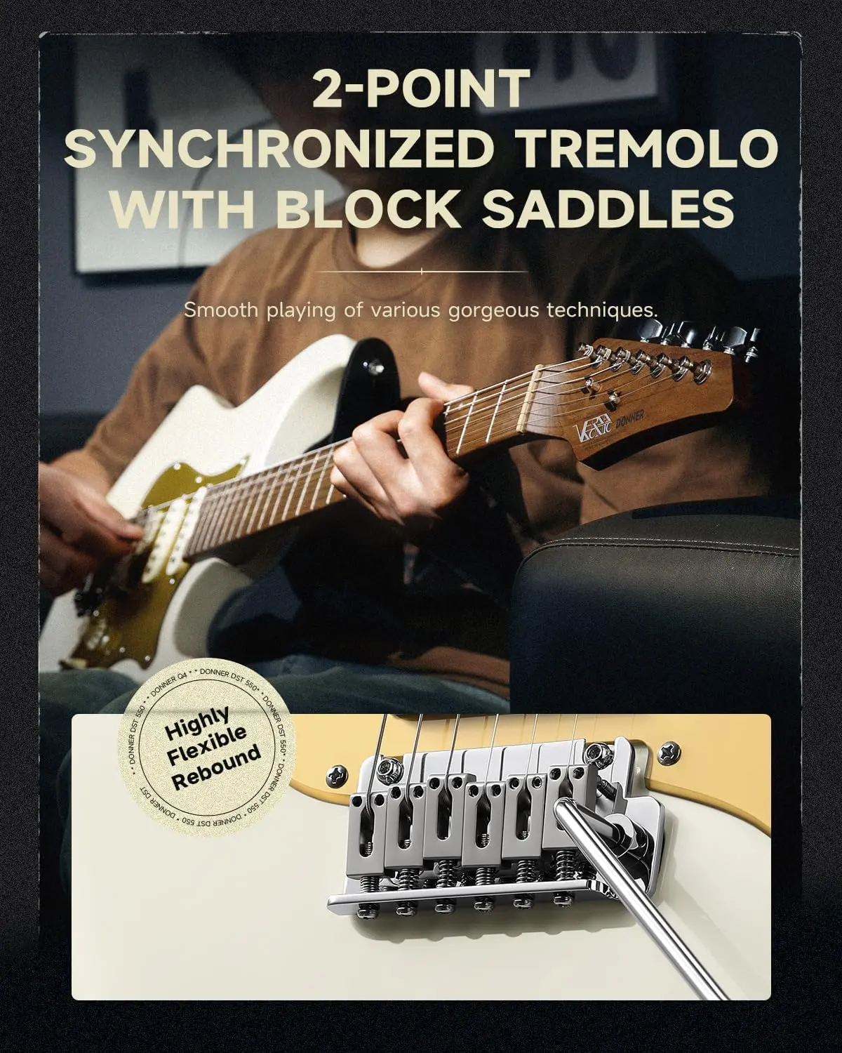 ·7-Tone Selection System with ThunderForge Pickups: An independent toggle switch allows easy access to 7 tone options. In single-coil mode, it delivers a classic sound with exceptional clarity. DST-550 features DONNER's ThunderForge pickups, with a switchable humbucker and two single coils. It also includes a two-point locking tremolo for versatile playing, seamlessly transitioning from classic, blues to modern high-gain.