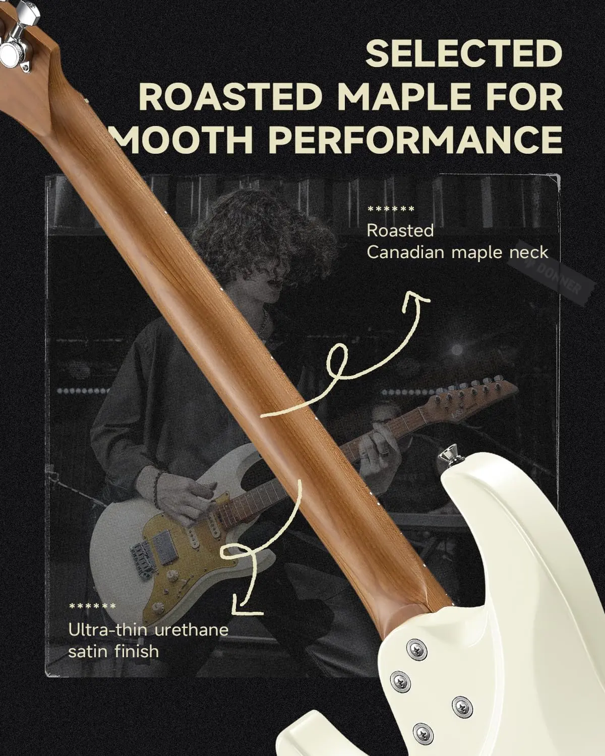 ·Carbonized Maple Neck: Made from carbonized Canadian maple, the C-shaped neck undergoes a 15-degree high-pressure process to resist environmental impacts, ensuring maximum stability and durability.