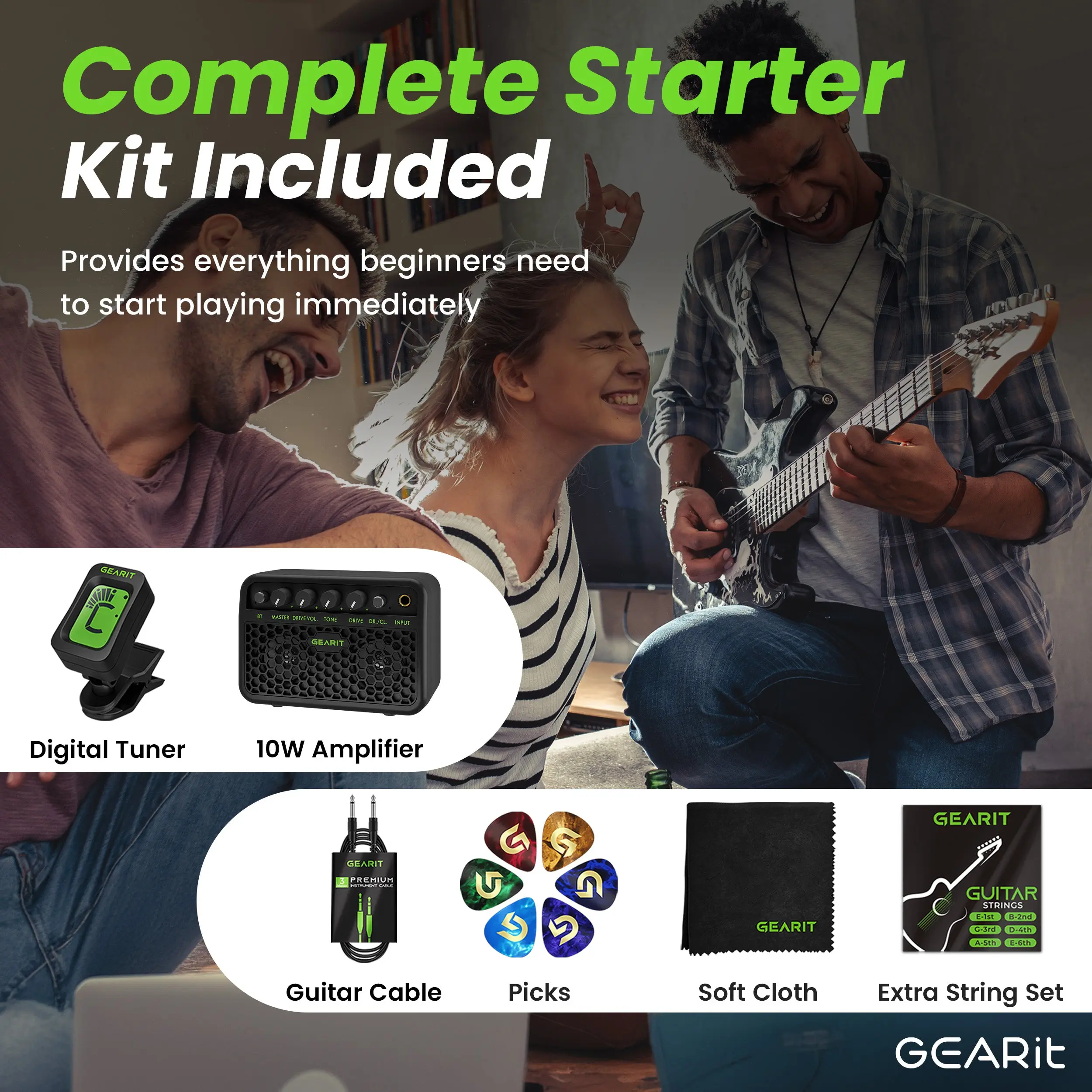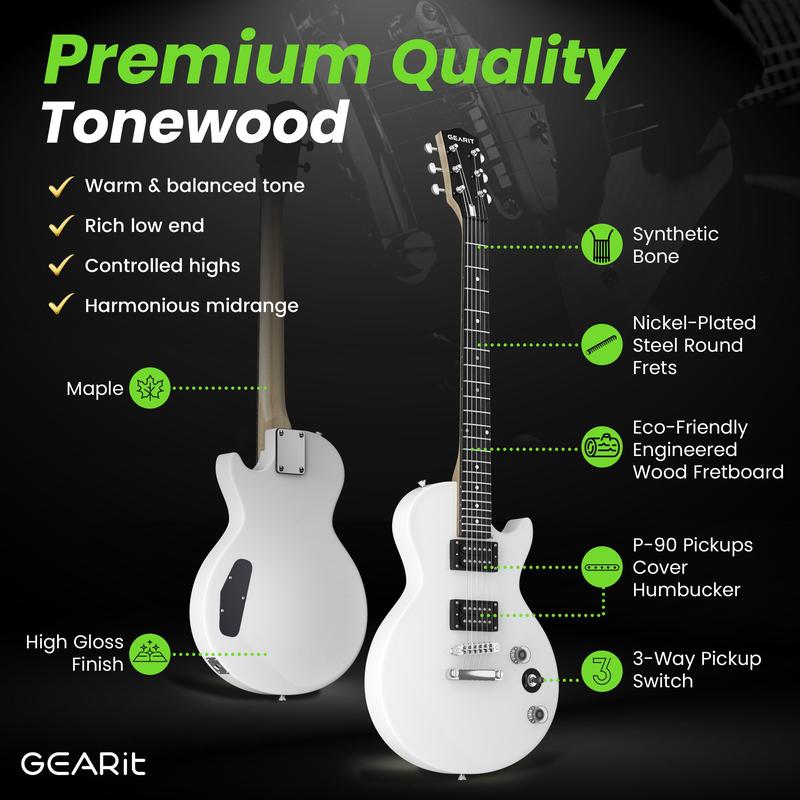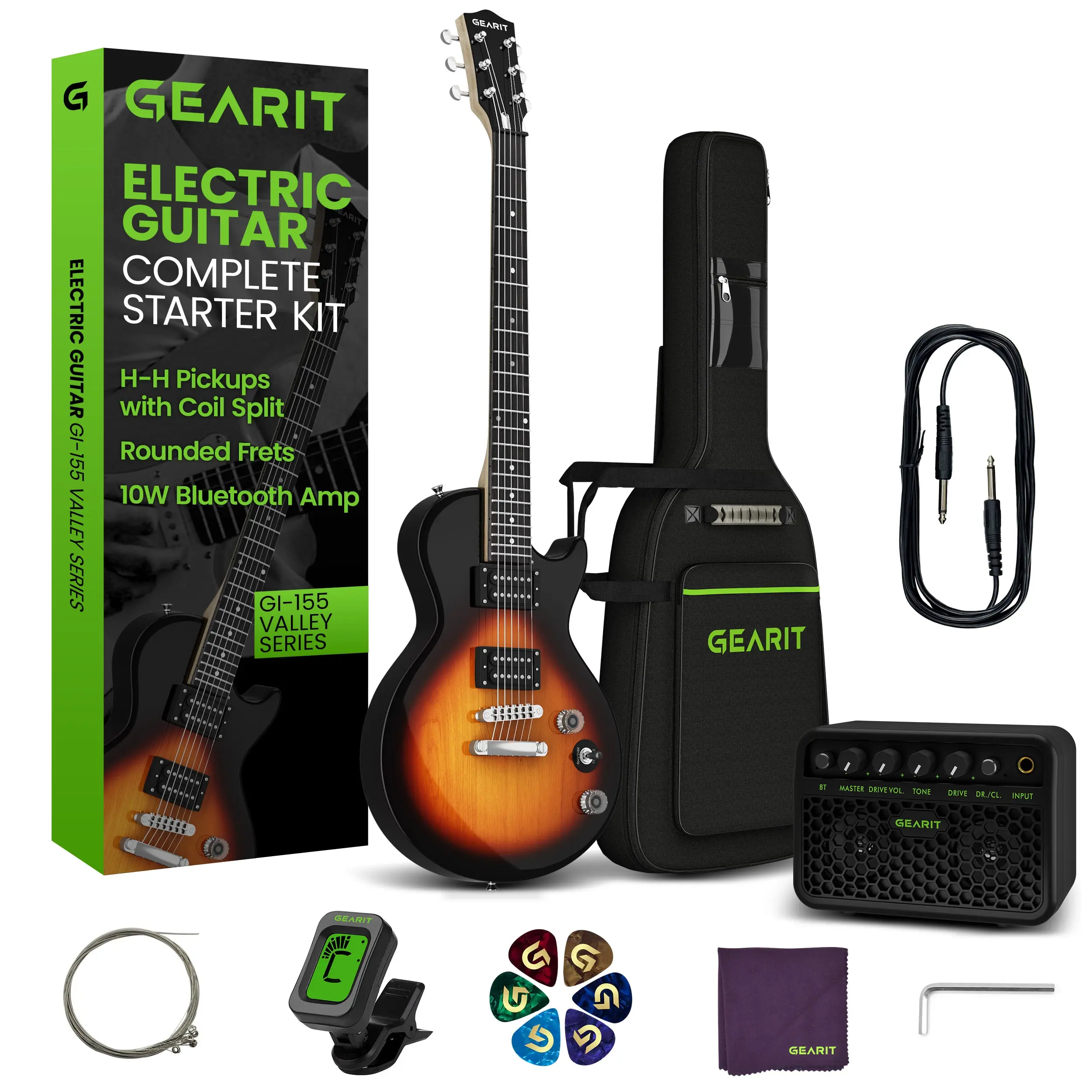 Includes the GI-155 Valley Series 39” Single Cut Electric Guitar with a coil split humbucker pickup, a rechargeable 10W amp with Bluetooth functionality to connect your phone/tablet and jam along, a padded 5mm gig bag, 6 guitar picks, a guitar strap, an instrument cable, an electronic tuner, extra strings, a soft cloth, and a truss rod adjuster.