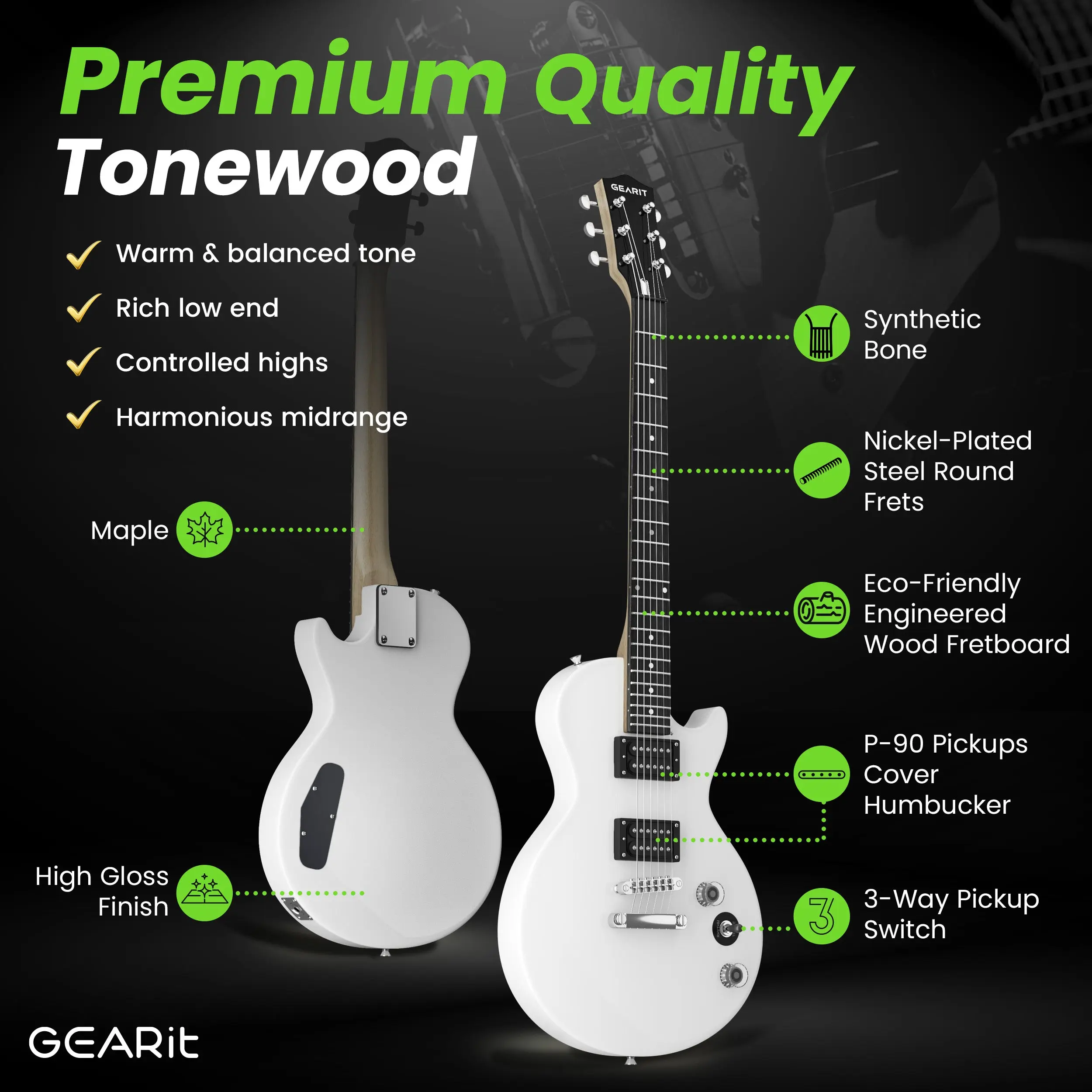 Rounded frets provide smooth playability, protecting your hands from scratches. The eco-friendly technical fretboard offers comfort, rich tone, and complexity. Diecast tuners ensure precise tuning, while the 3-way pickup switch lets you easily toggle between treble, mid, and bass tones. Customize your sound further with responsive volume and tone knobs.