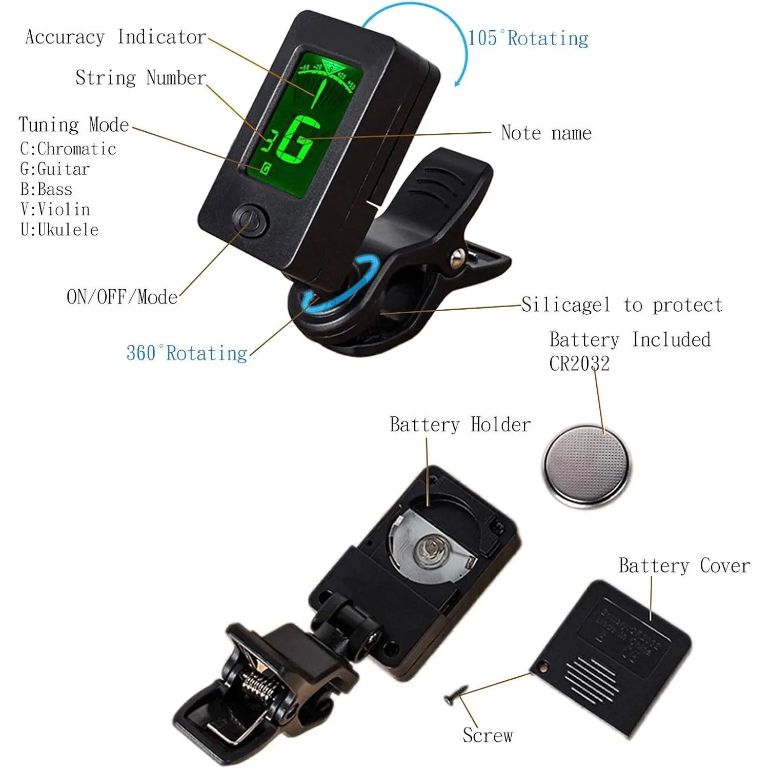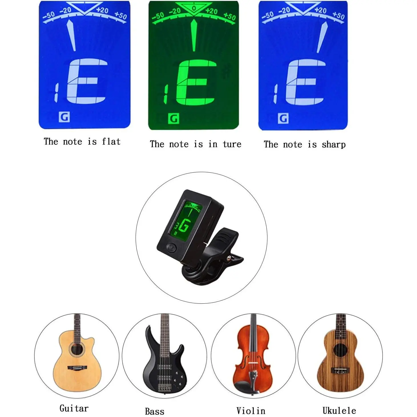 【HIGH GUITAR TUNER:】 High detection and vibration guitar tuner clip-, no background noise, good for applicable to a variety of environments, designed for Guitar, Chromatic, Bass, Violin, Ukulele, etc