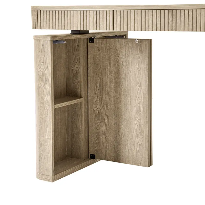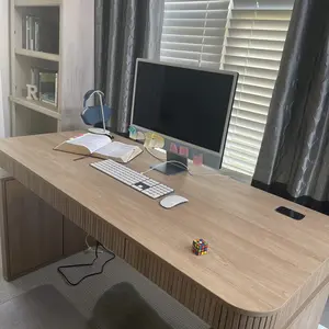 The desk includes built-in cable management, neatly hiding cords. This ensures a tidy desk setup, blending aesthetics with modern functionality. Ideal for contemporary home offices or workspaces, it offers a seamless user experience.