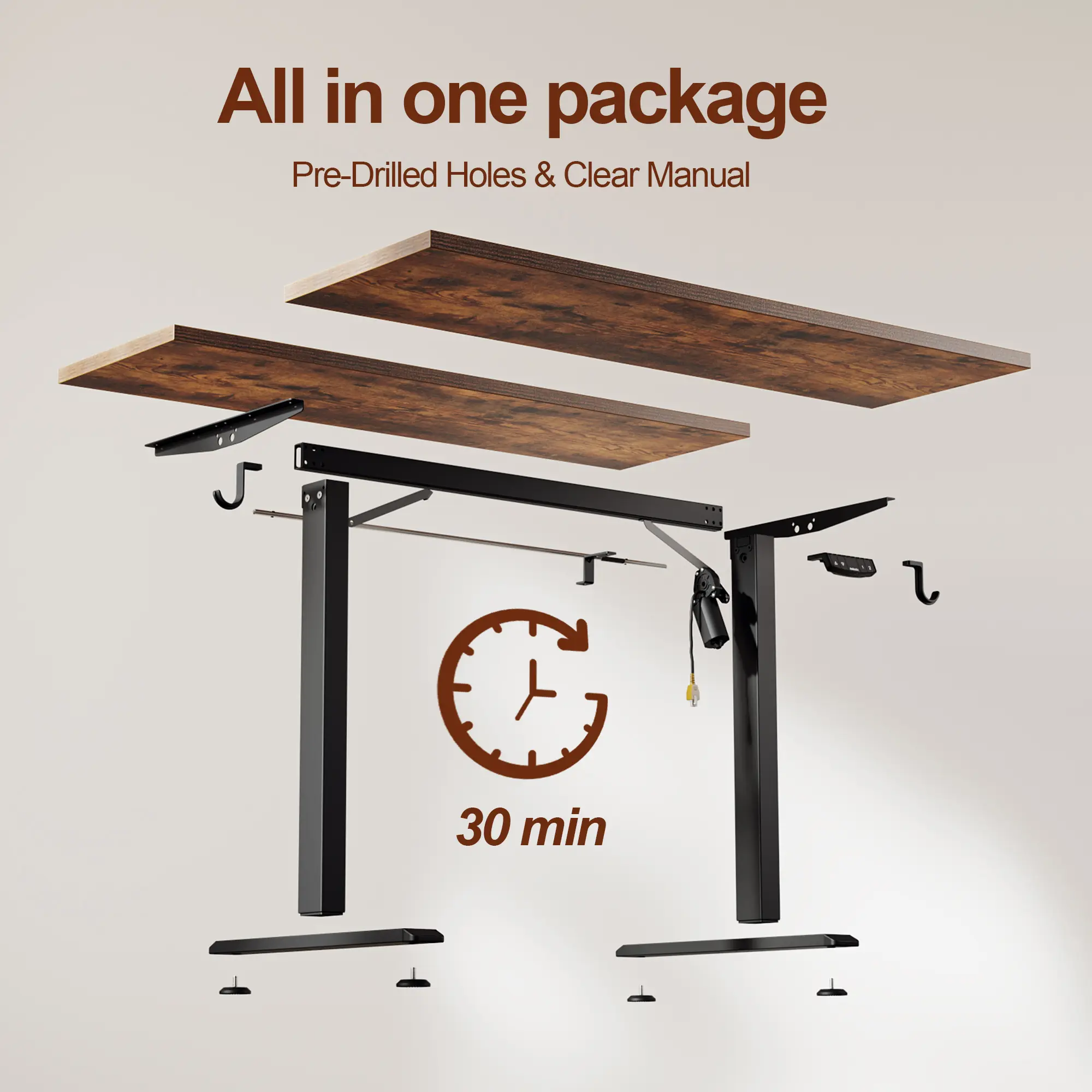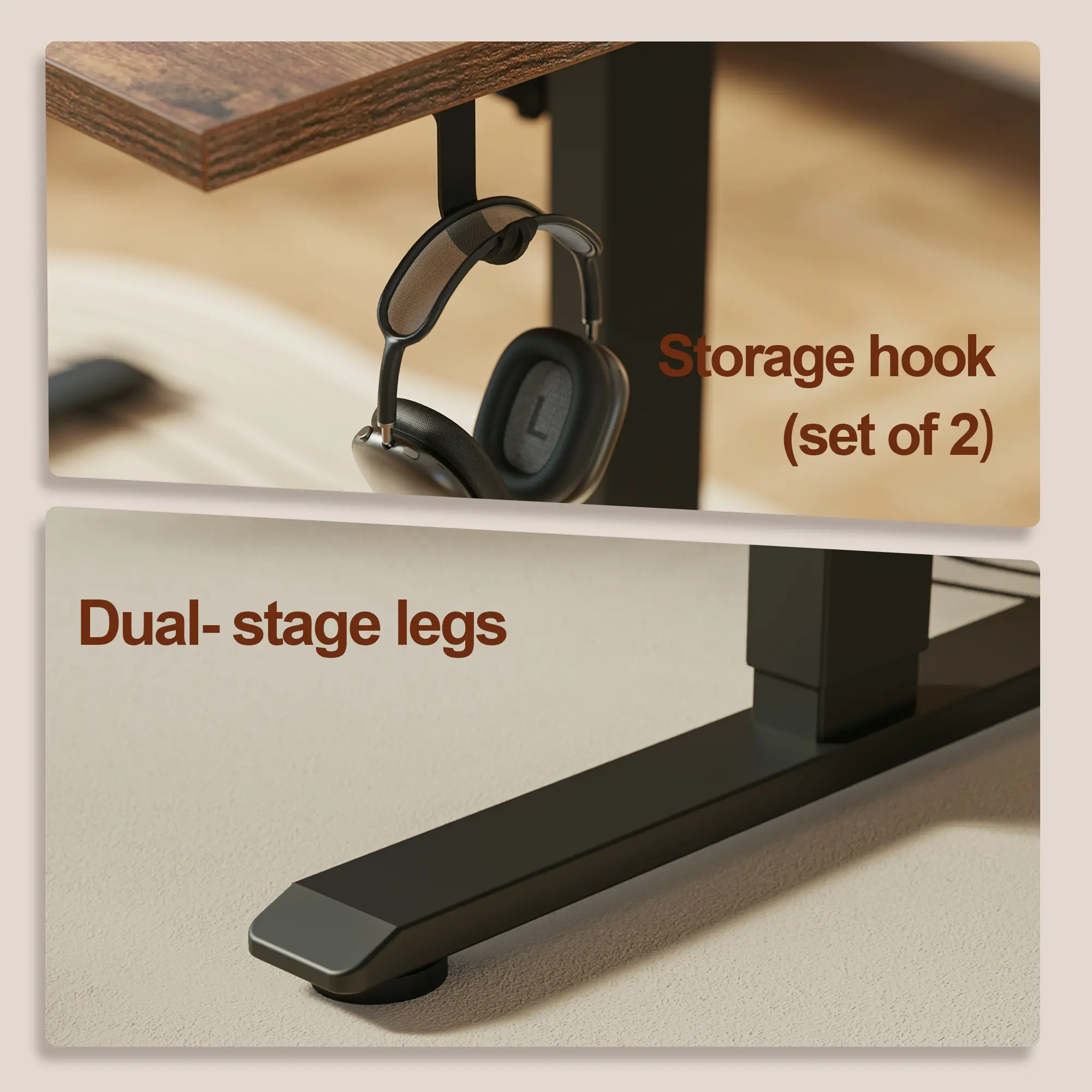 The wide surface accommodates multiple monitors and accessories with ease. Dual side hooks offer convenient storage for headphones, bags, helping keep your workspace tidy. Comes with all necessary tools and a step-by-step guide for hassle-free assembly.