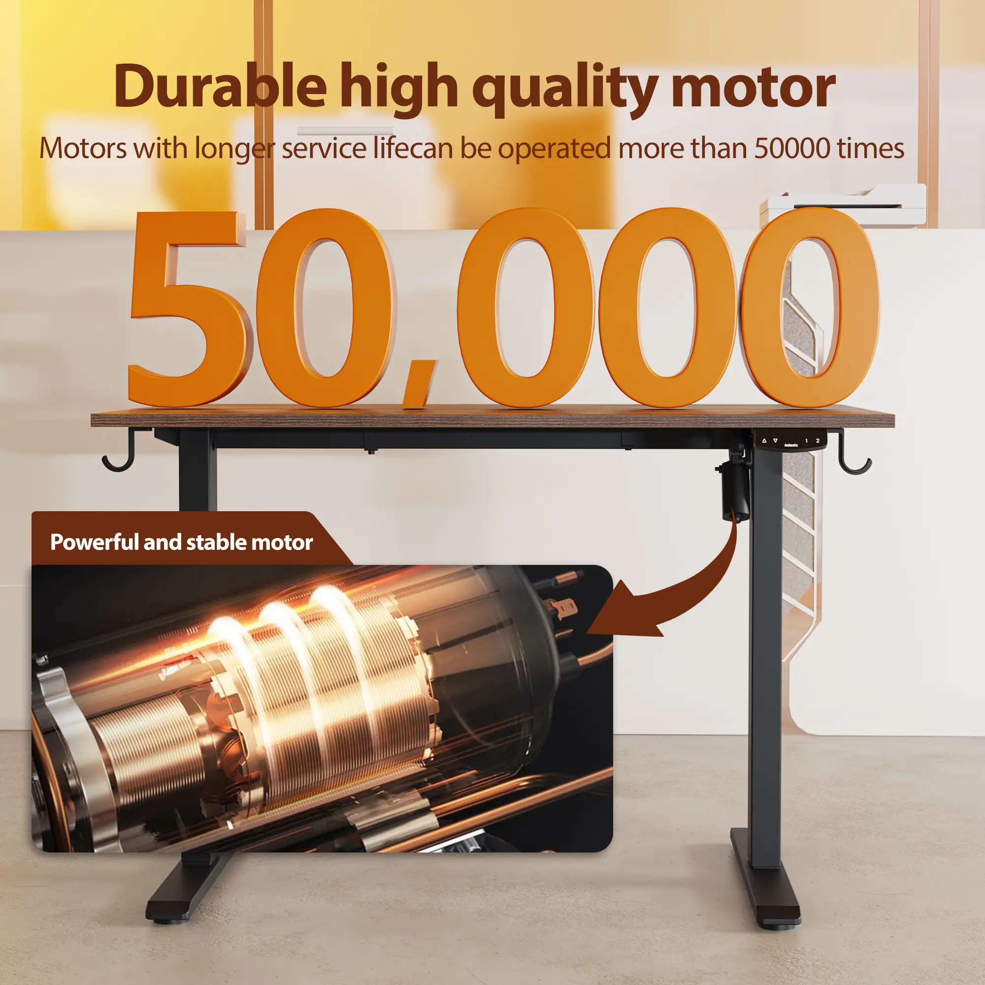 Built with an industrial-grade steel frame and T-shaped legs, the desk supports up to 154 lbs with exceptional stability. The motor is durability-tested with over 50,000 lift cycles. The low-VOC desktop materials meet federal and state air quality standards, creating a healthier indoor environment.