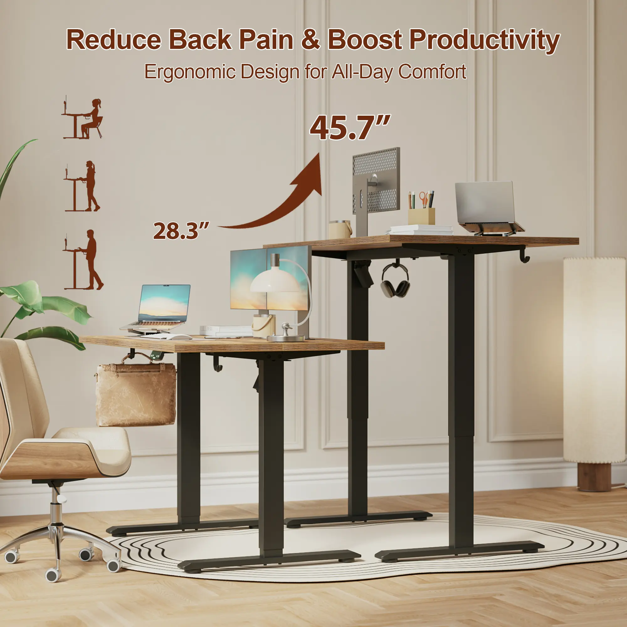 Powered by a strong and quiet motor (operating under 55 dB), this electric standing desk offers smooth height transitions from 28.3'' to 45.7''. Effortlessly switch between sitting and standing to stay active and reduce fatigue during long work sessions. Designed with ergonomics in mind, it helps relieve pressure on your neck and back, ensuring a more comfortable experience whether you're working or gaming.