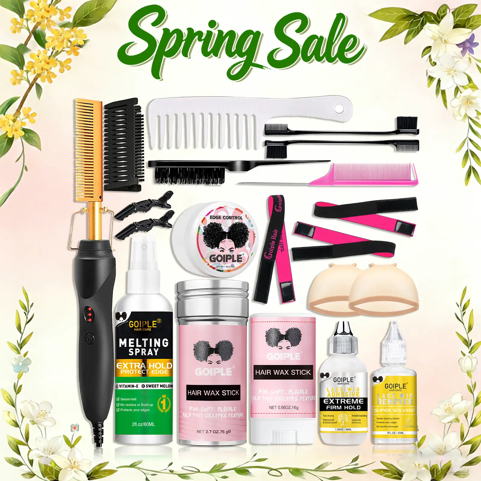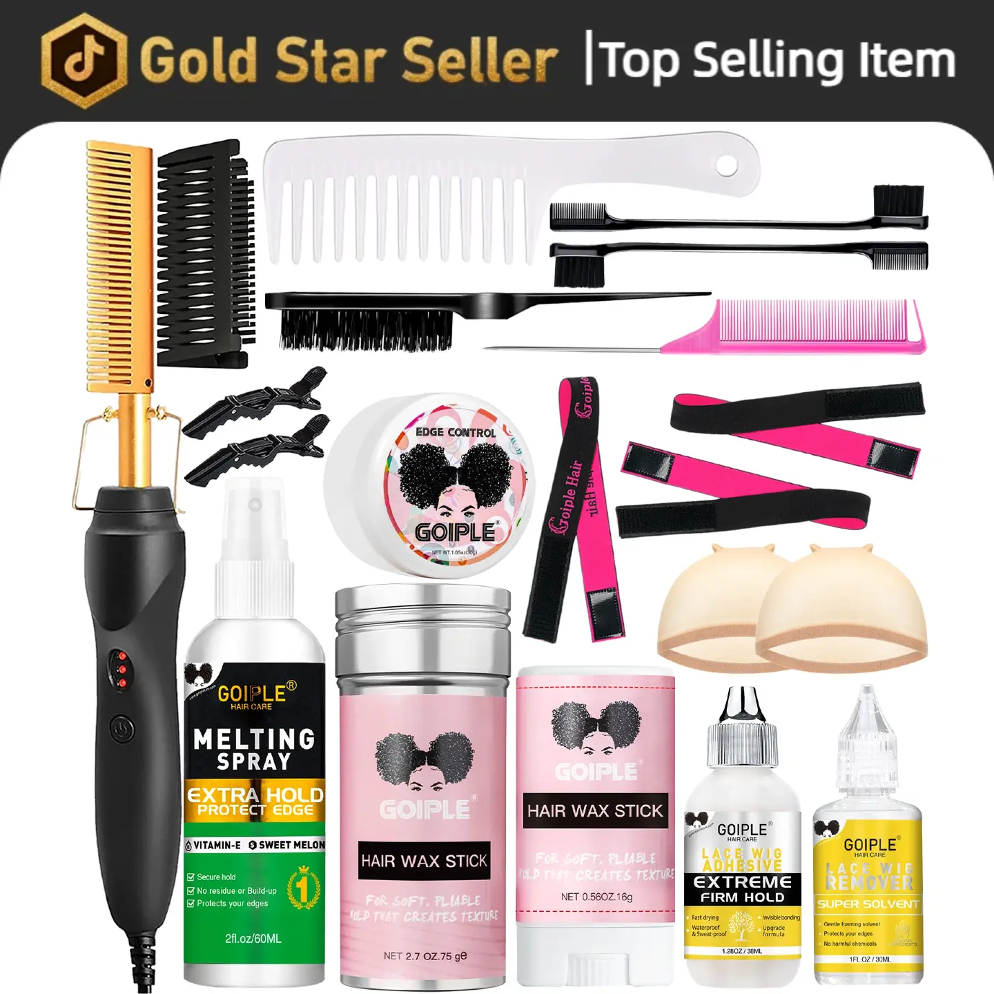 Came literally in 2 days every fast shipping. Hot comb works very very well I love it it came with 2 was sticks , 3 head bands , 2 hair clips, 2 edge brushes, a wide tooth comb,a hair brush, and a really cute rat tail comb, edge gel, lace glue and lace malting spray and hair caps Every nice product