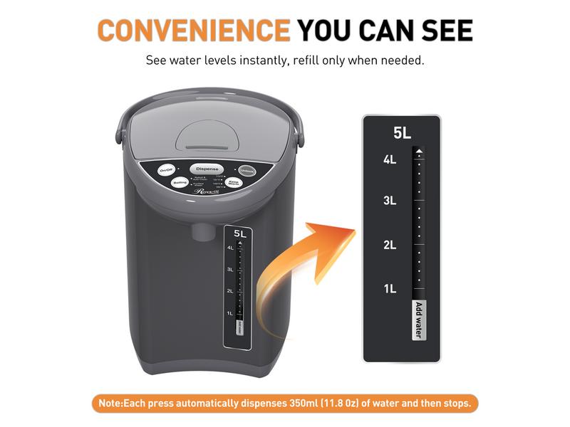 5. Rosewill Electric Hot Water Boiler and Warmer, Hot Water Dispenser with Auto Dispense Function, 5 Temperature Settings, Large Capacity 5.0 L (5.3 QT) - Gray