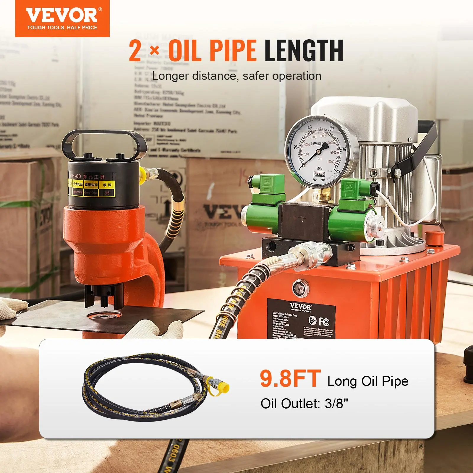 • Extended Oil Reach: Do you want to stretch further without breaking a sweat? Our electric hydraulic pump is the perfect solution. It comes with three lengthened oil pipes that are 9.8 ft/3 m long, allowing for longer-distance operation and enhanced security. Plus, having three oil pipes makes them easier to replace.