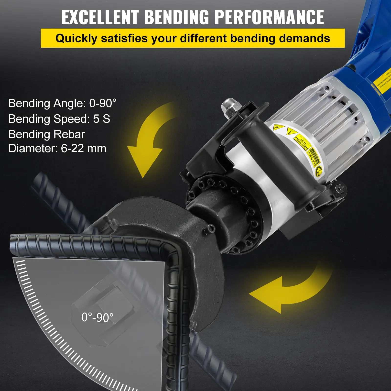 • 0 - 90 Degrees Excellent Performance: This electric rebar bender is designed with excellent performance. It helps save valuable person-hours by bending rebar 1/4'' to 7/8" (6 to 22 mm) within 5 seconds. 1/4'' / 6 mm #2 Rebar(0-55°), 7/8" / 22 mm #7 Rebar(0-90°). It is able to satisfy your various bending demands.