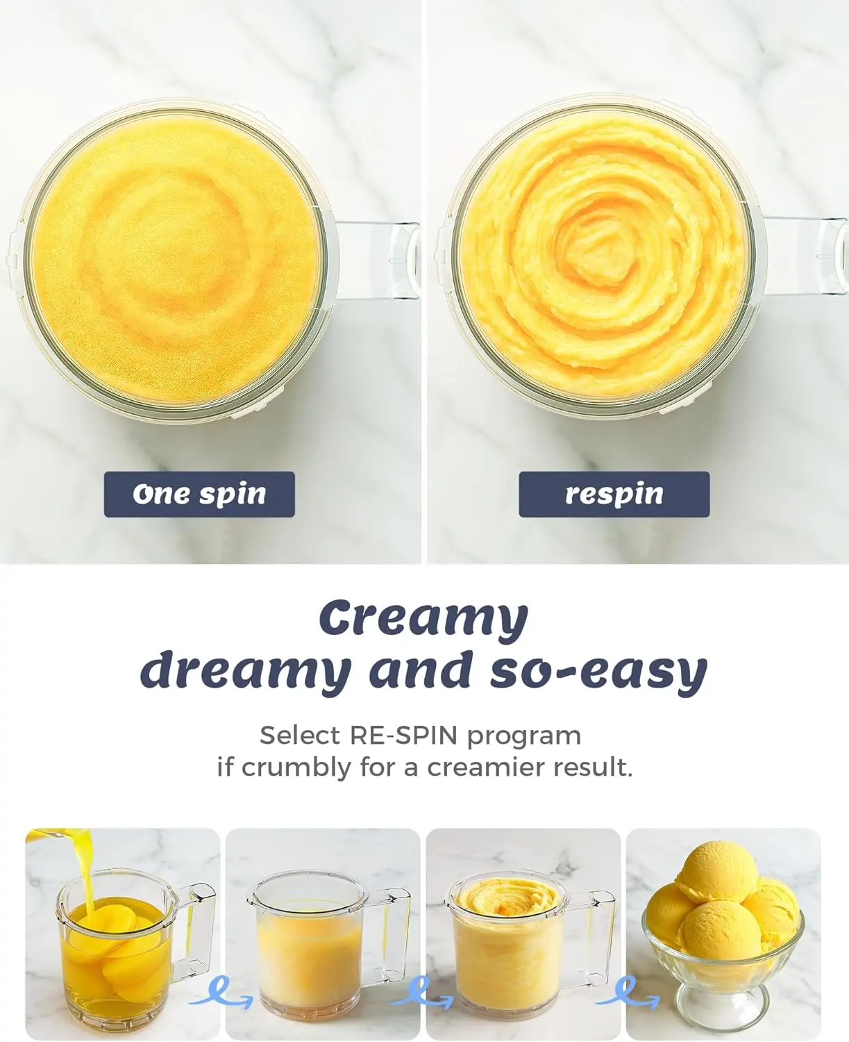·RE-SPIN: Consider the Re-Spin button your final touch for perfection. A simple press after the initial cycle provides an extra churn, meticulously crafting a denser, silkier consistency. This delivers a luxuriously soft, smoother, and velvetier frozen dessert that rivals your favorite creamery.