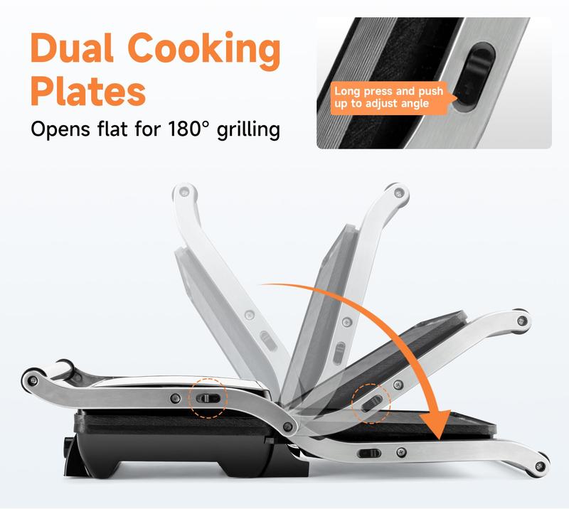 ·3-IN-1 MULTIFUNCTIONAL - Floating hinge adjusts to accommodate any burges size . When turned on at 180° it will act like a large electric grill (2 large 11.35 x 9.25 inch cooking plates) for grilling burgers, steaks, veggies and anything else you’re craving quickly and easily! 1500W Double-sided heating technology allows you to make delicious meals quickly.
