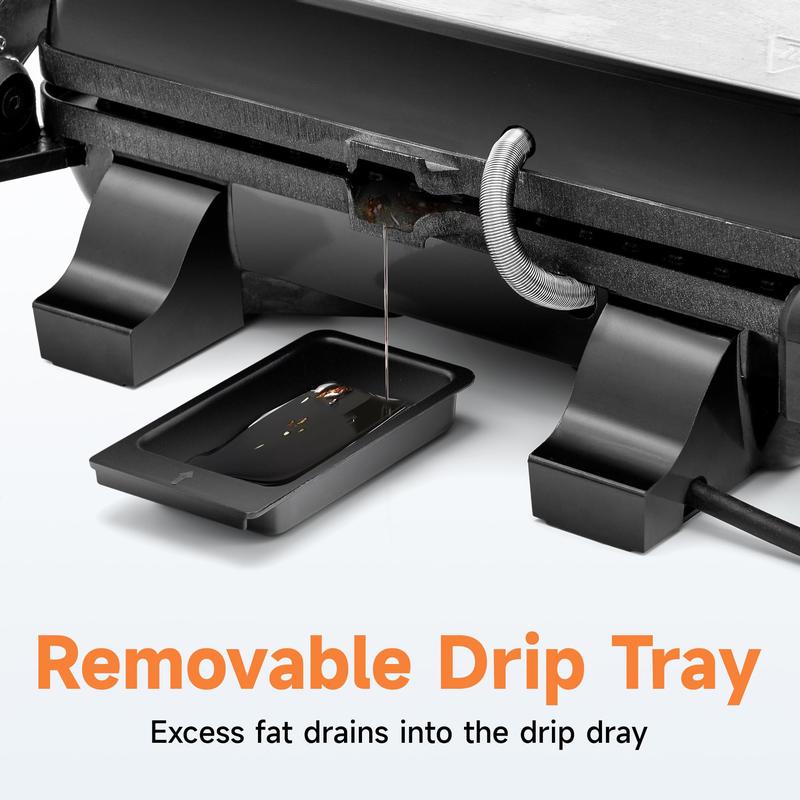 ·EFFORTLESS CLEANUP - Thanks to the non-stick grill plates, the indoor grill is exceptionally easy to clean. A simple wipe-down with a damp cloth once the searing grill has cooled is all it takes (Non-stick plate not removable). Additionally, a convenient drip tray is included to effortlessly gather excess fat and liquid, ensuring your cooking area remains clean and free from grease.