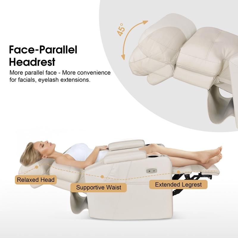 The recliner includes an adjustable headrest for a level face position, reducing neck strain and enhancing client comfort. It also comes with a 360° swivel tray, perfect for nail services. The tray detaches and stores in the hidden armrest compartment, maintaining a sleek look. The chair is easy to assemble, taking only 20 minutes, and comes with a 2-year parts replacement warranty.