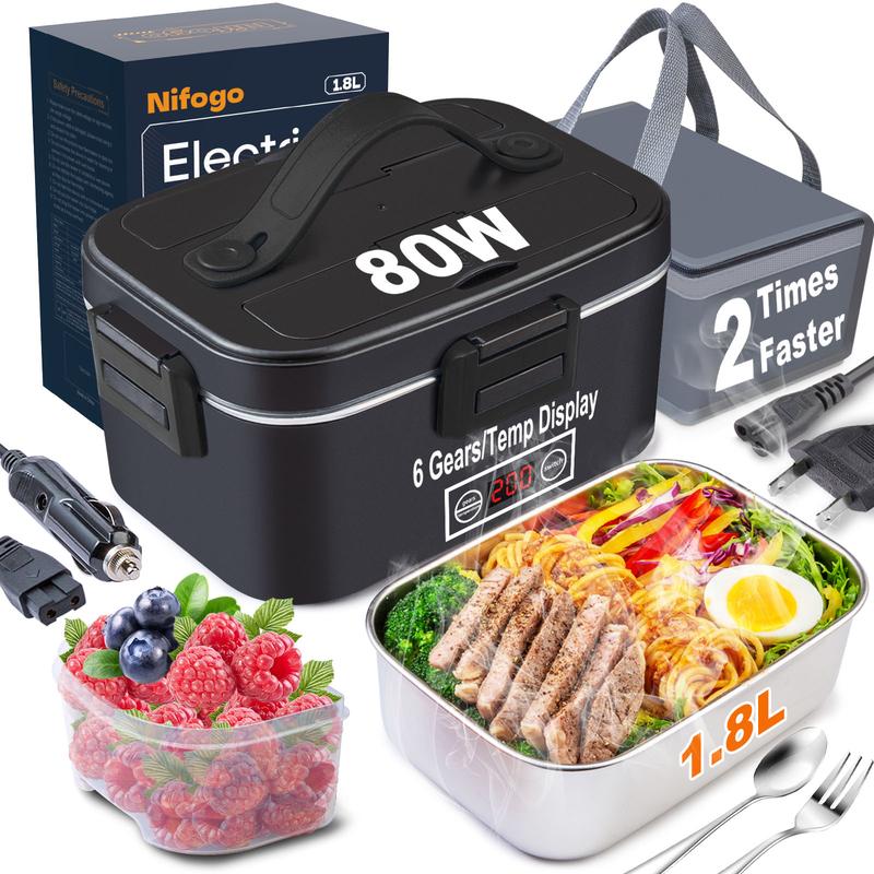 This electric lunch box food heater is very convenient and useful. It can be used for road trips, kids nursery, work, school for heating / reheating meals and leftovers, In the car, hotel etc. with no extra dishes or spills to take care of, Comes with carrier silverware two chargers auto and wall