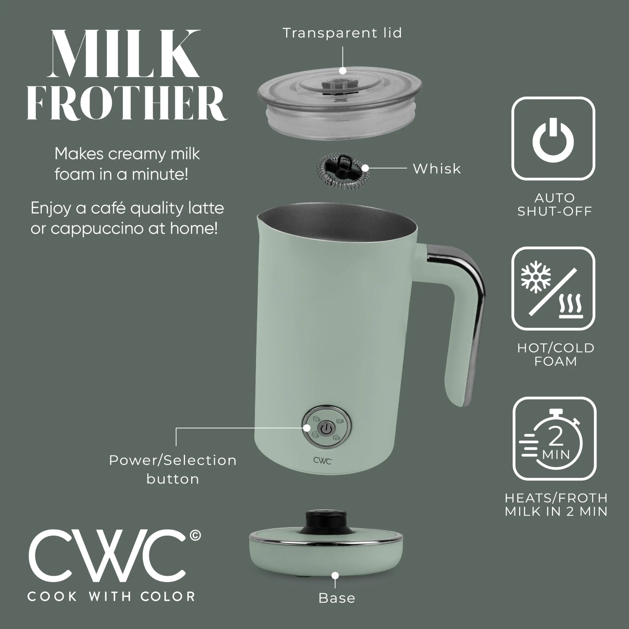 5. COOK WITH COLOR 4-in-1 Electric Milk Steamer and Frother - 2-Minute Heating and Frothing, Hot and Cold Foam Maker for Coffee, Latte, Cappuccino, Macchiato, Milk Warmer, Auto Shut Off, Sage