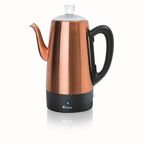 Euro Cuisine Electric Percolator - 12-cup in Copper Finish The Euro Cuisine 12-Cup model of classic stainless steel percolator with Copper Finish and keep-warm function brings coffee making to your kitchen. Piping hot water percolates through the grounds, and pulses up into the glass knob on top to create the familiar "perk-perk" sound.   What You Get Electric Percolator Manufacturer's Limited 3-Year Warranty