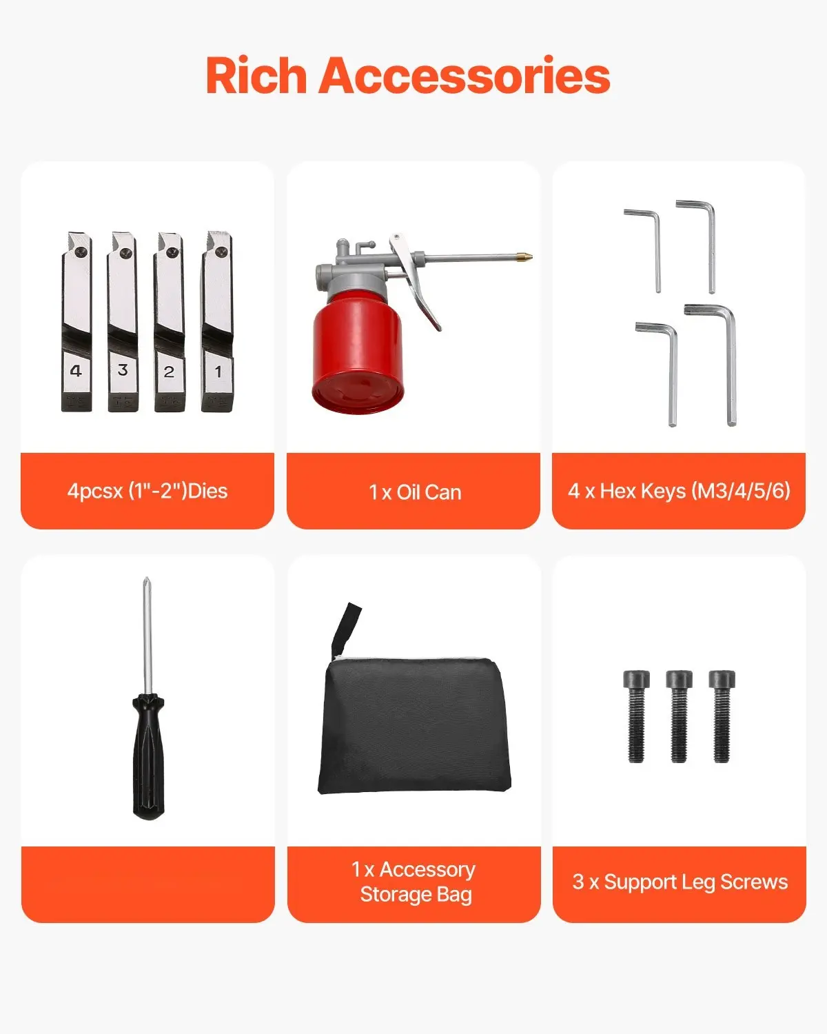 ·Rich Accessories: This pipe threading machine comes with useful accessories, including 4pcs (1/2" to 3/4") dies (pre-installed on the machine), 4pcs (1" to 2") dies, 1 oil can, 4 hex keys (M3/4/5/6), 1 cross screwdriver, 1 accessory storage bag, and 4 support leg screws.