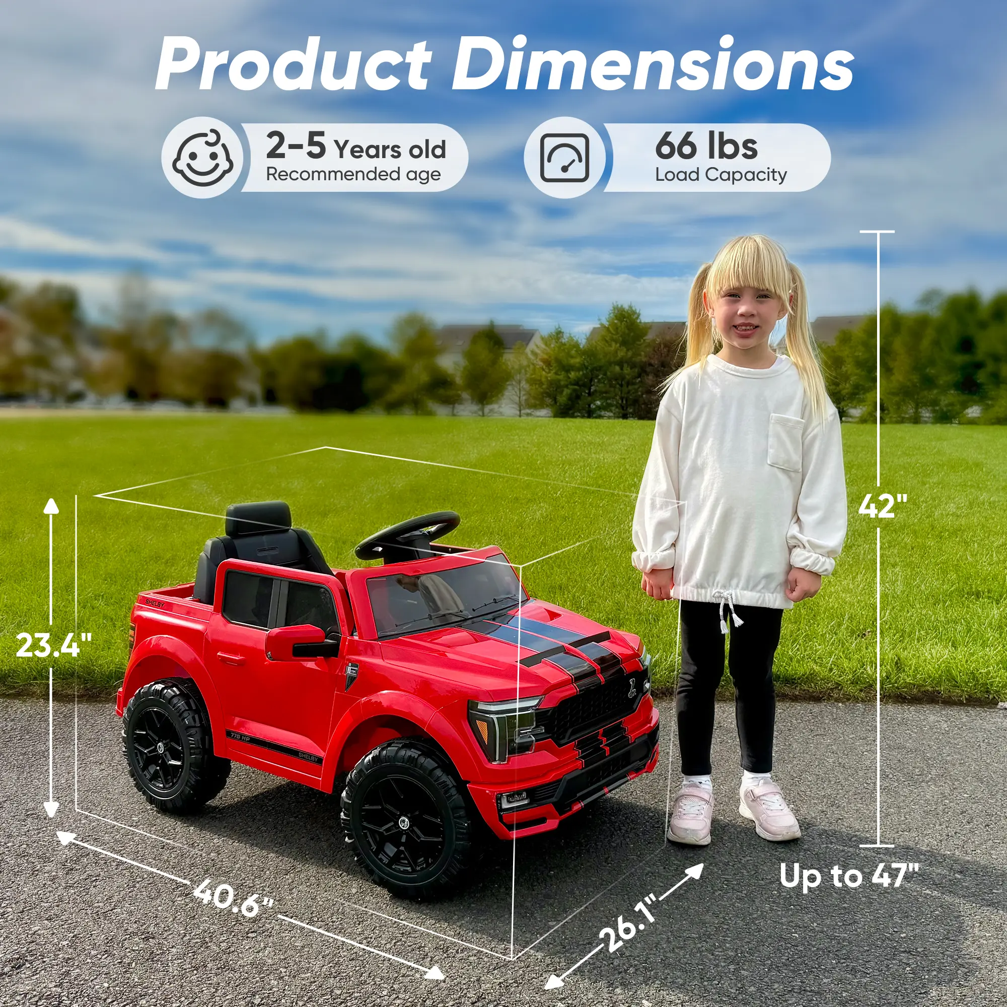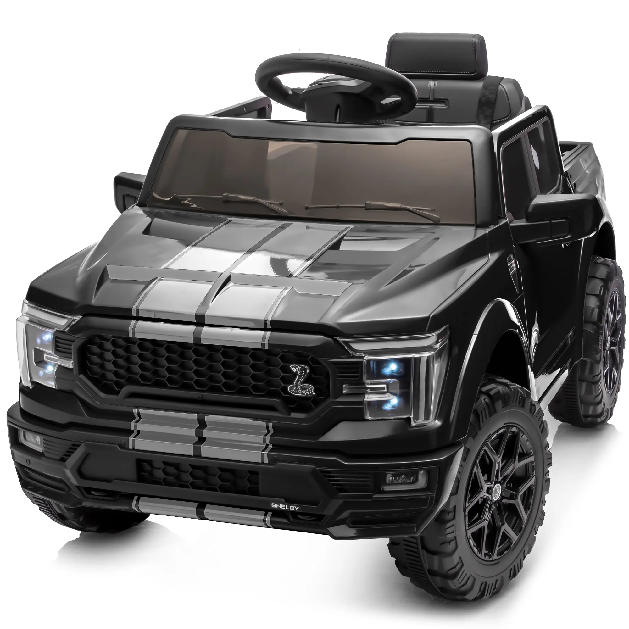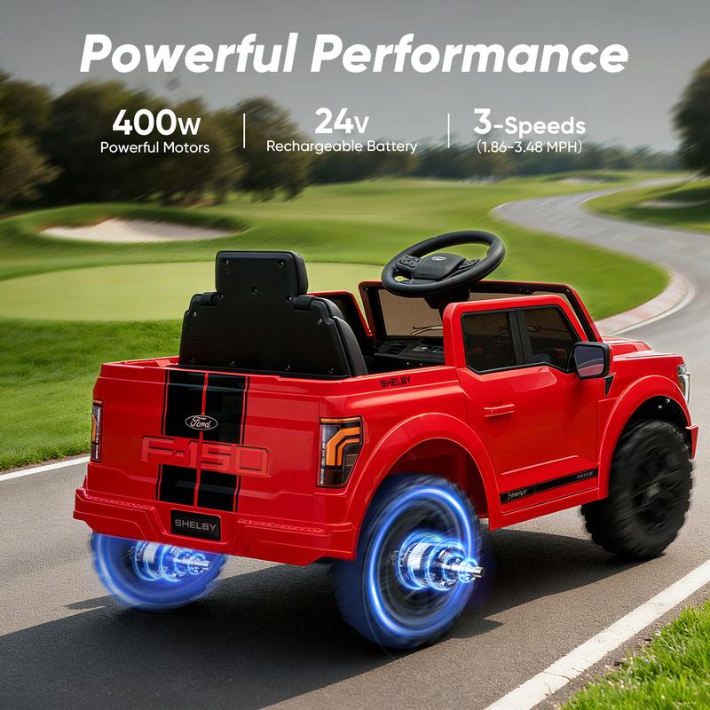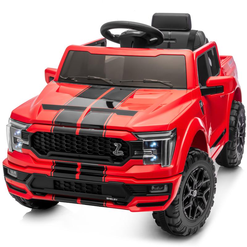 This officially licensed Ford Shelby F-150 children's electric ride-on toy car perfectly replicates the classic, iconic pickup's bold design and authentic details for girls & boys. No kids refuse this ideal gift for birthdays or holidays
