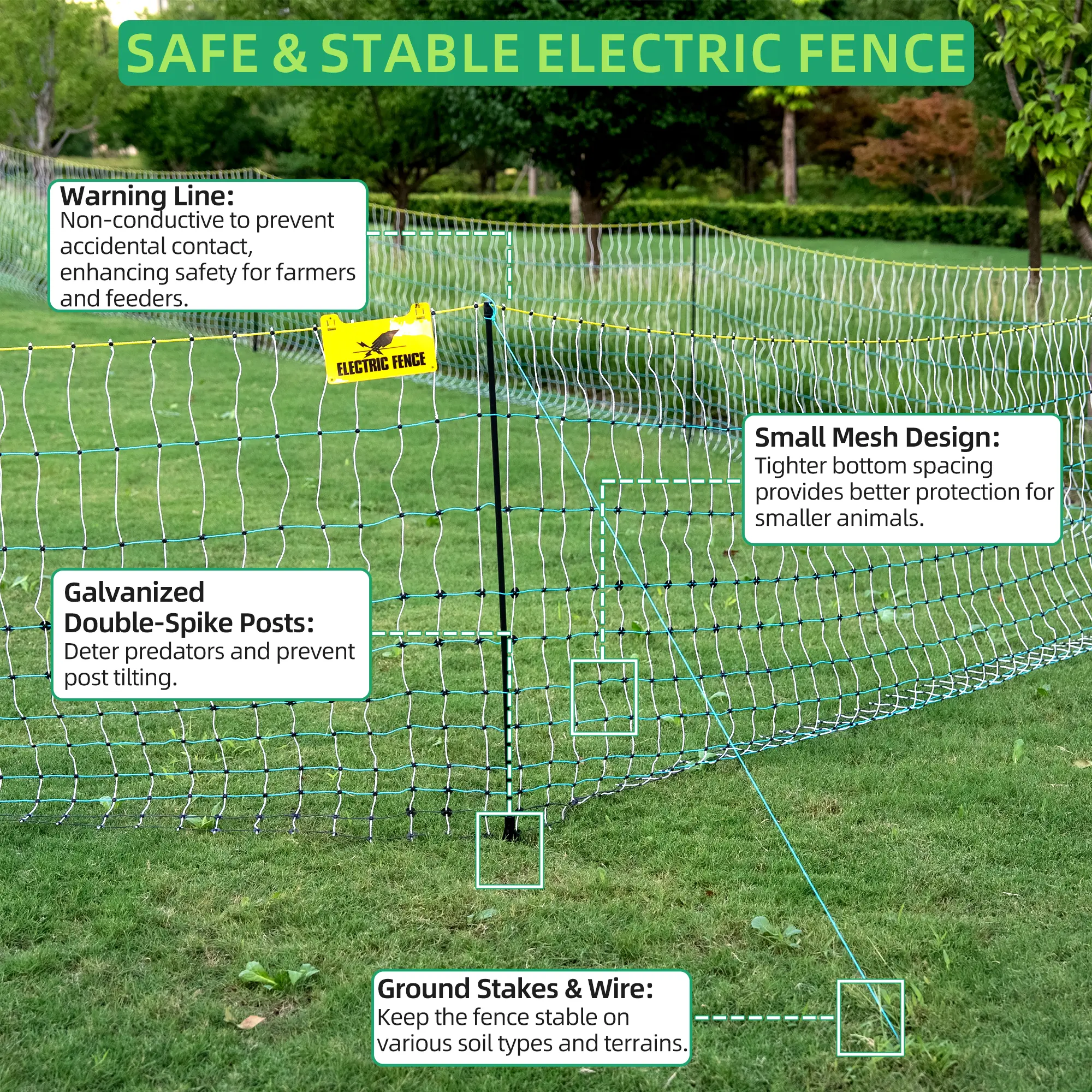 ·Easy to Install: Our pre-fabricated electric fence requires no assembly—just unroll, stake, and connect. Its lightweight design makes it easy to move, ideal for rotational grazing or expanding protection.