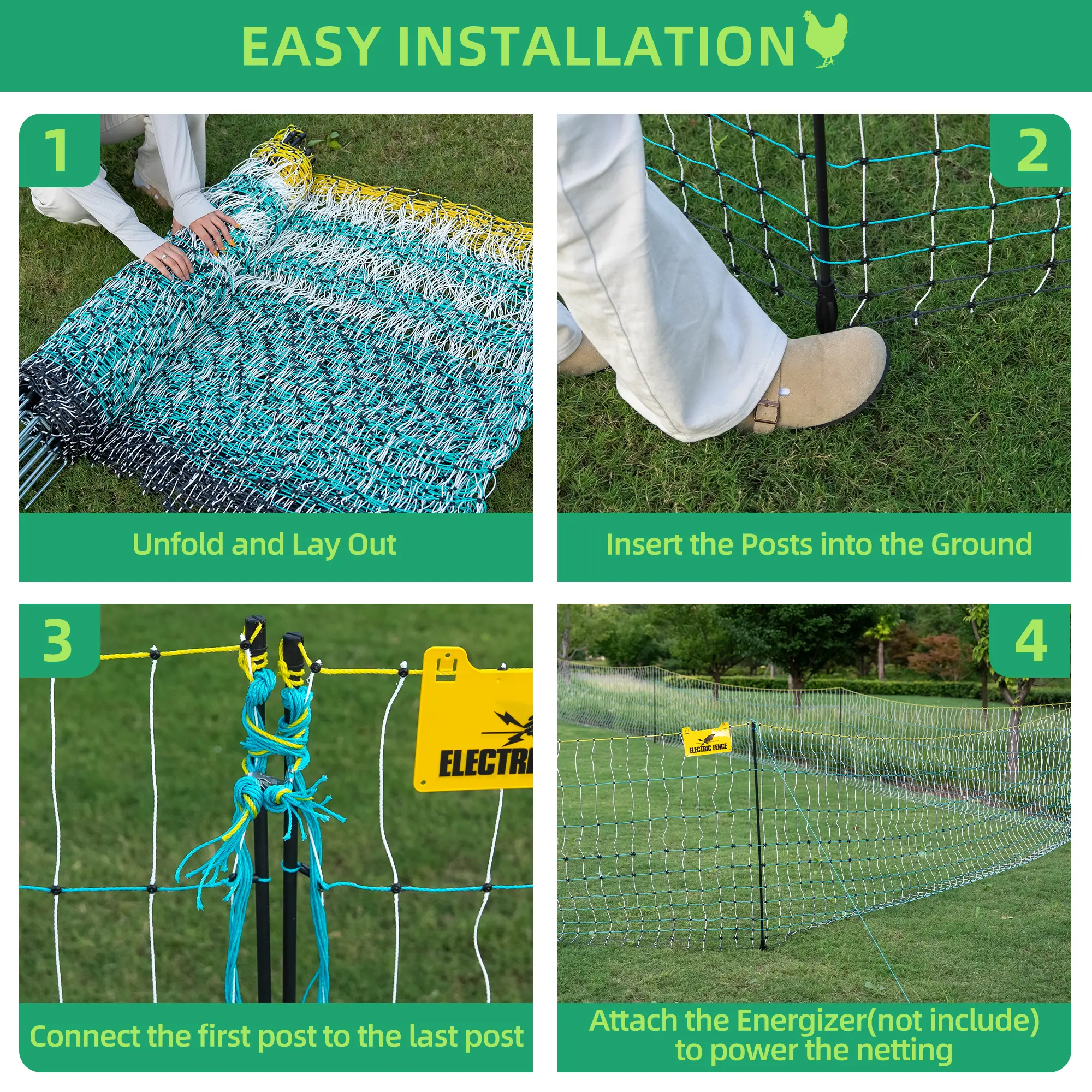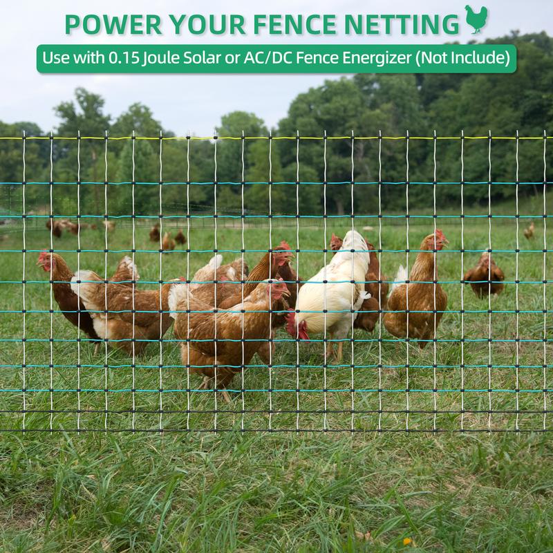 ·Solar Electric Fence Kit: A fence energizer is needed to power the netting. The solar energizer is sold separately; we recommend the WHALEMOTOR model. Easy to set up and versatile, it's a favorite for free-range farmers.