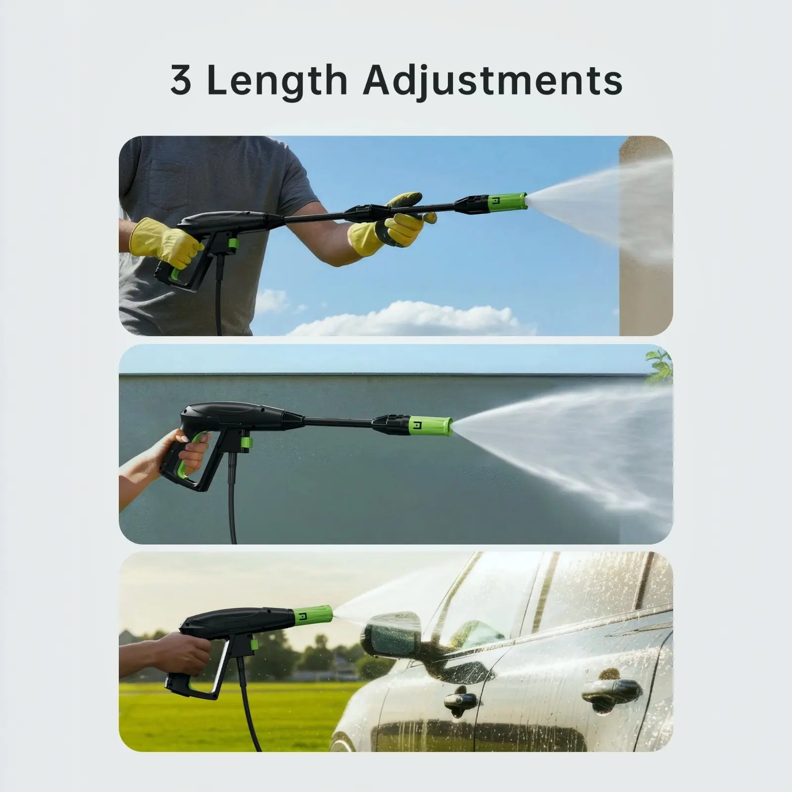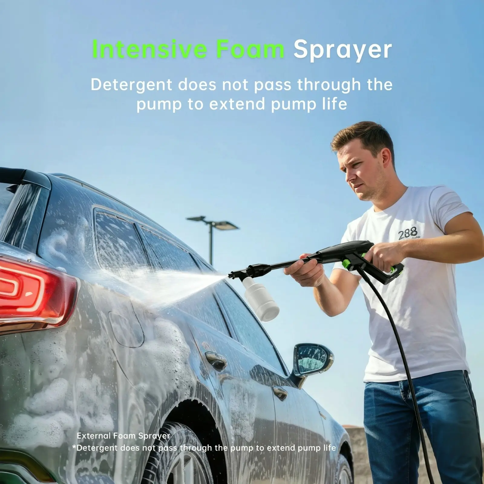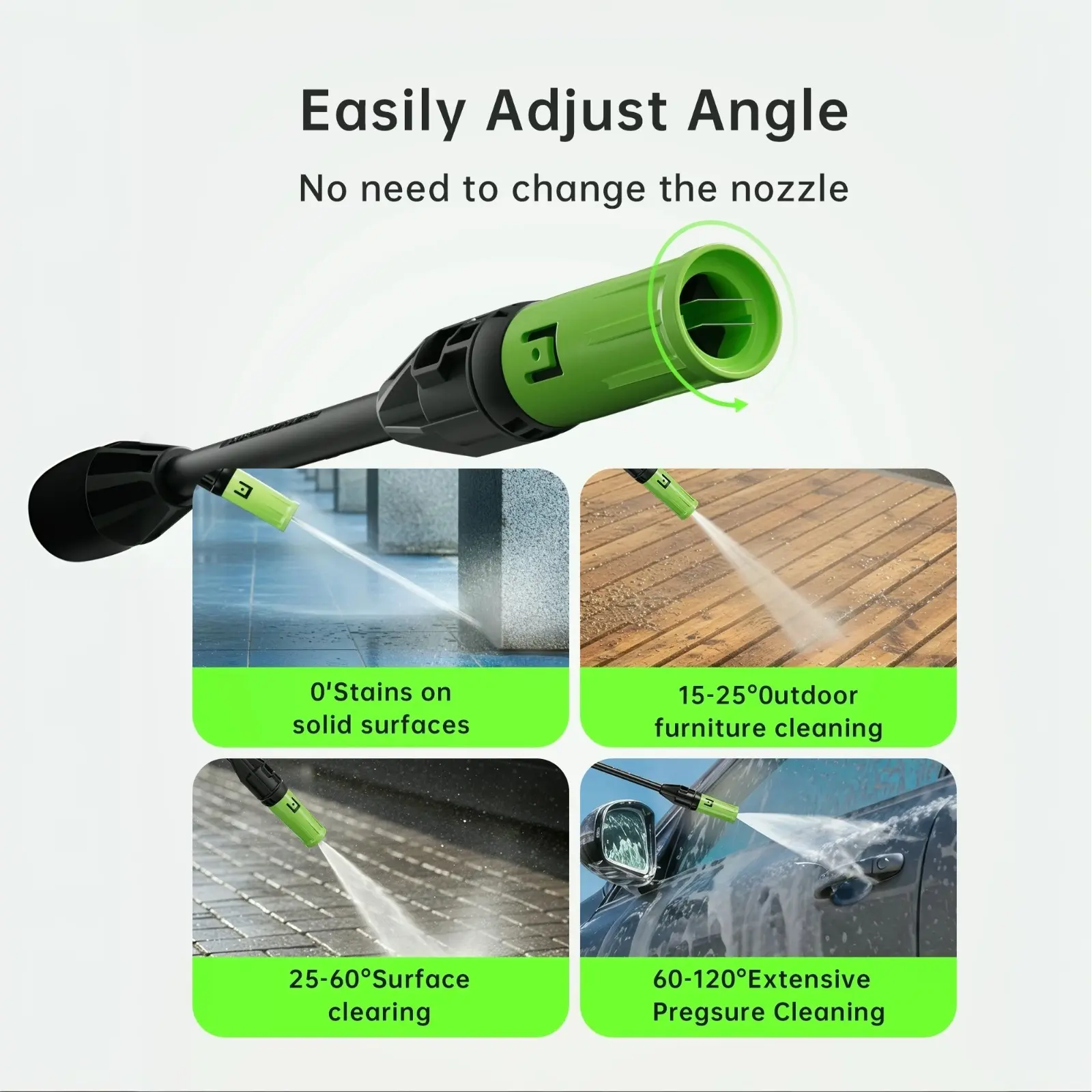 Convenient Cleaning Design - All-in-One Nozzle: Switches spray angle from 0-120° for adjustable pressure. - External Foam Pot: Produces dense foam for effective cleaning.