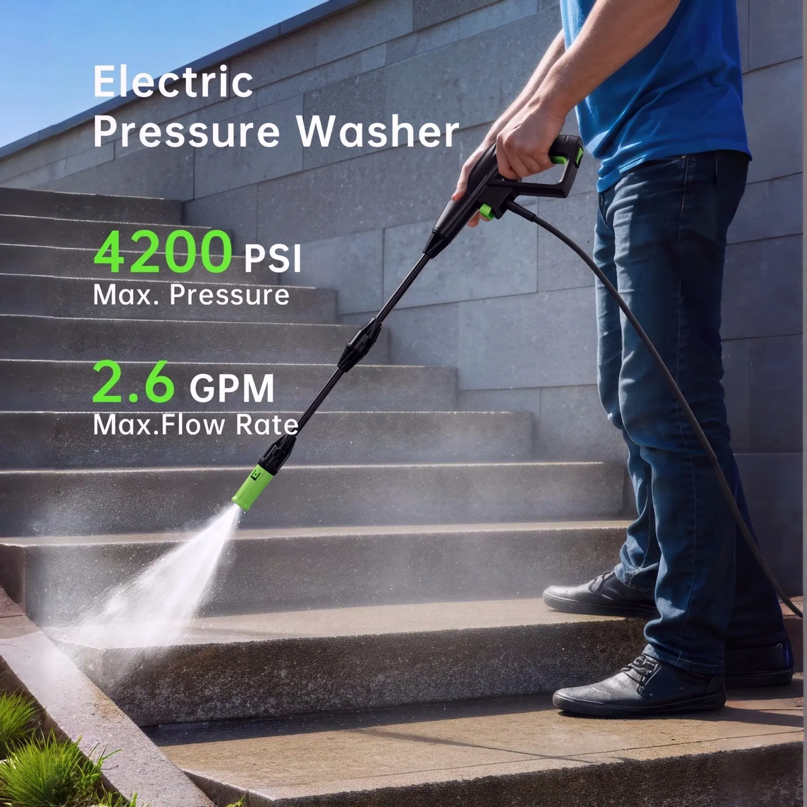 Powerful Performance - 4200 PSI Max Pressure: Ideal for home cleaning tasks. - 2.6 GPM Water Flow: Efficient for cleaning concrete, pavements, driveways, patios, decks, walkways, cars, boats, homes, fences, furniture, and more.