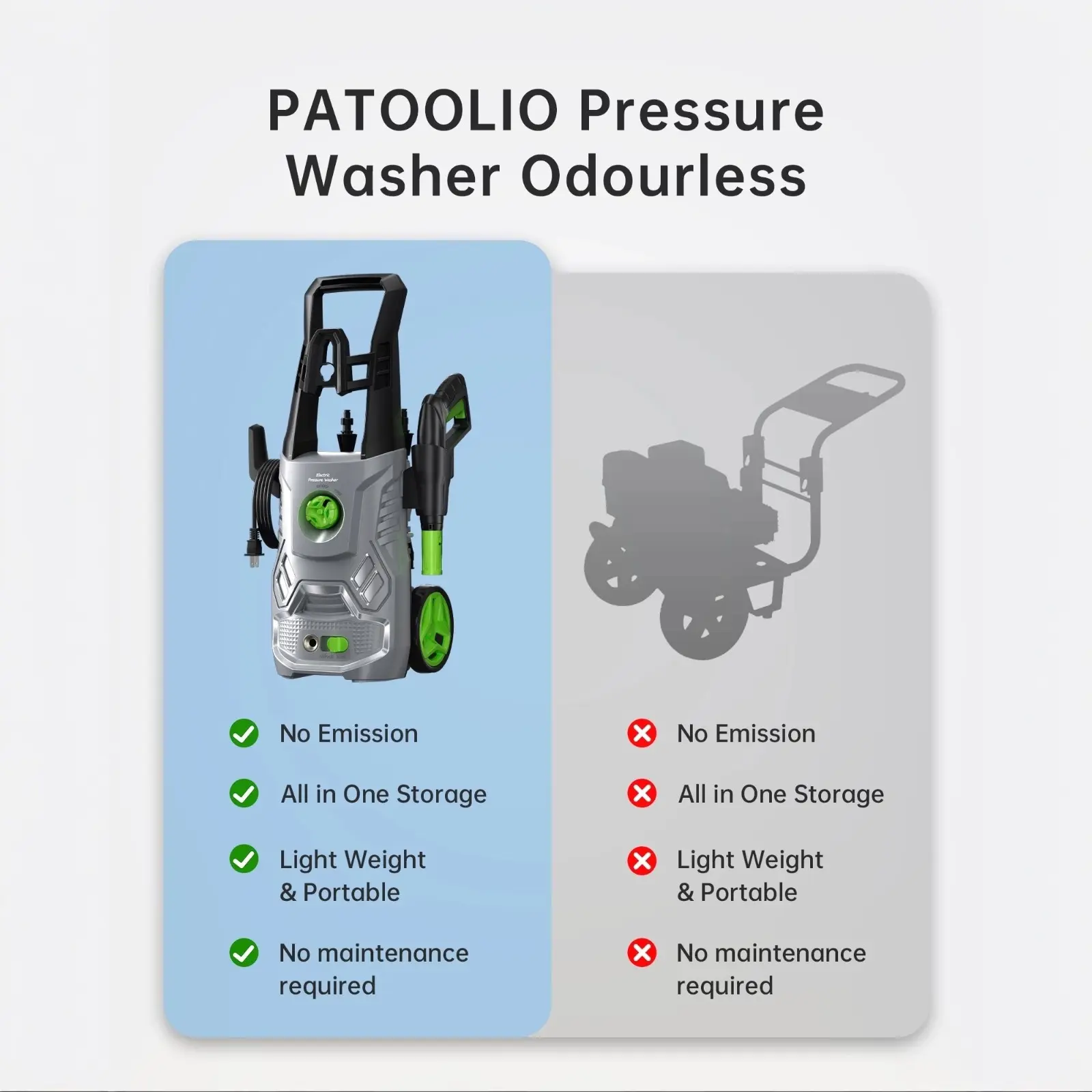 ·Compact and portable: The pressure washer is lightweight and easy to install. It comes with a 23-feet high-pressure hose, two rollers, and an anti-tipping design for stability. It can also draw water directly from a bucket. 🚰