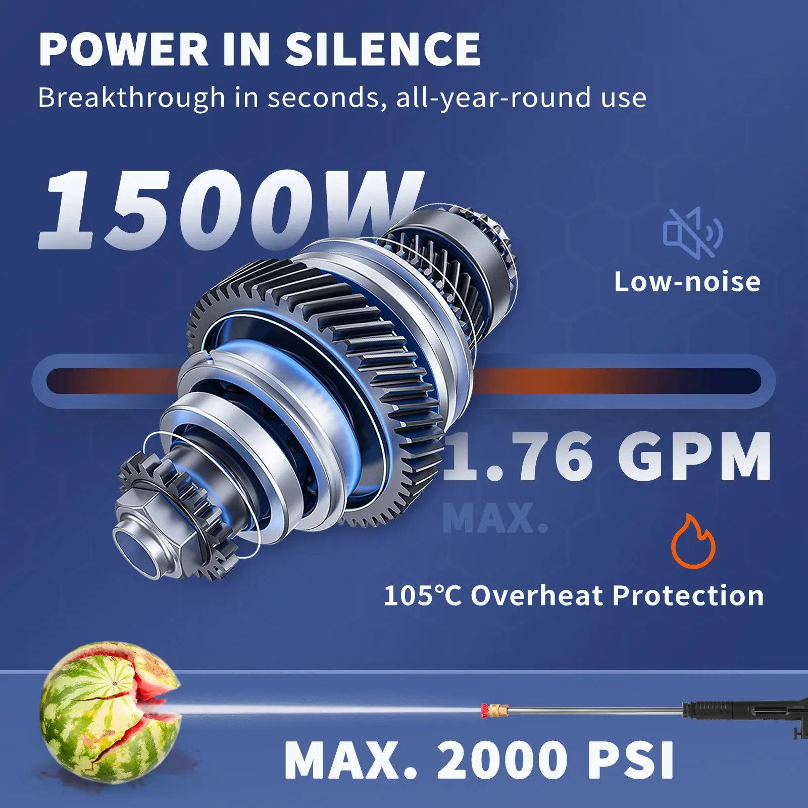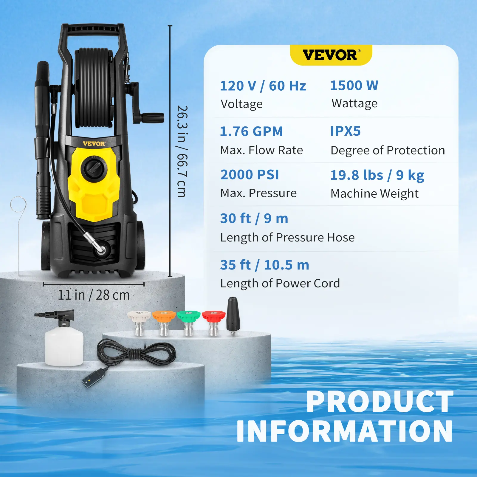• 2000PSI High-pressure Washer: Built with a powerful 1500 W motor that generates a high water flow rate of up to 1.76 GPM. Hence, VEVOR’s electric pressure washer can completely clean up old paint, oil, weed, and other stubborn stains. Ideal for homes, RVs, patios, fences, decks, driveways, cars, lawn equipment, etc. Automatically stops working when temperatures reach over 105℃, ensuring ultimate security and consistent high quality performance. It is ETL certified.
