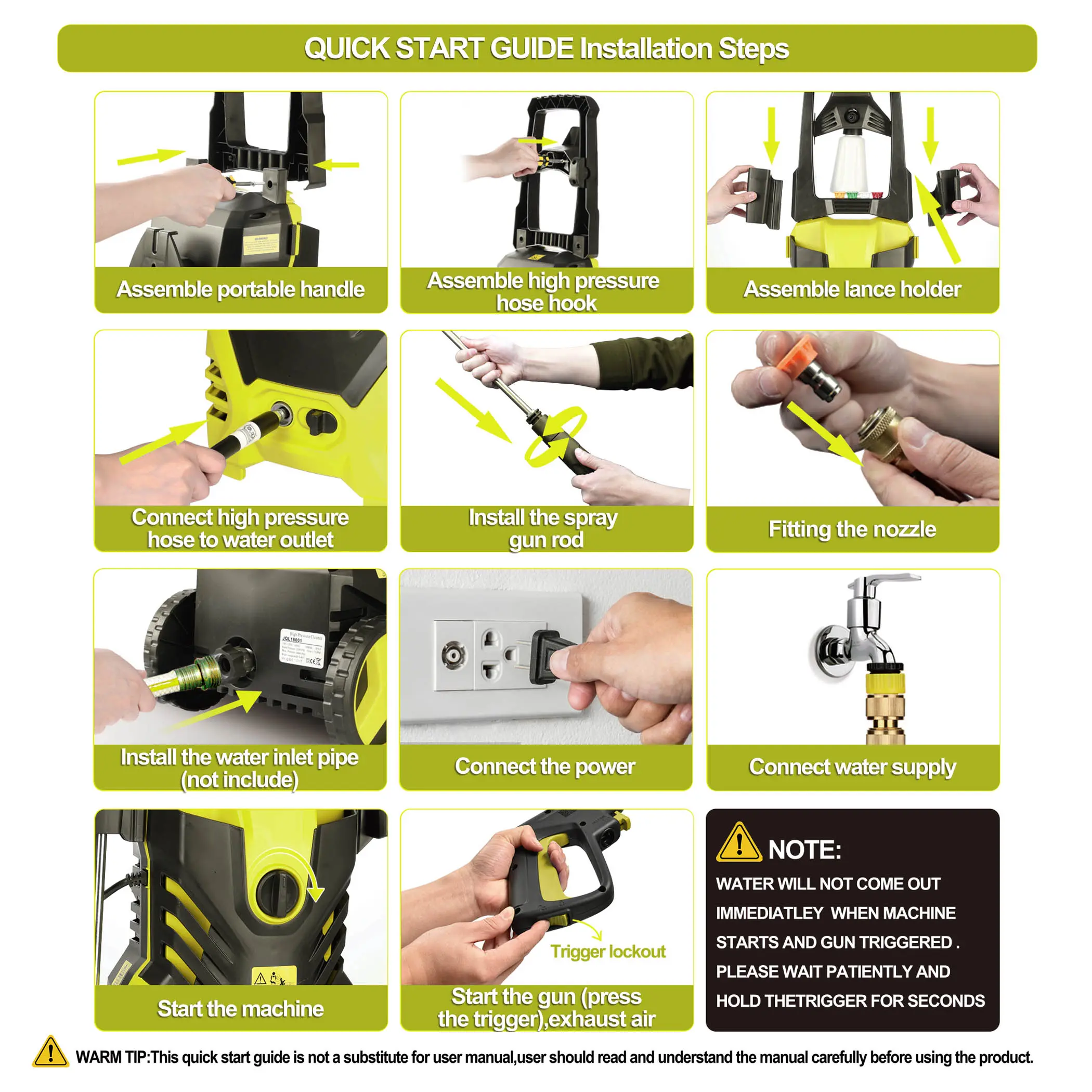 ·Convenient and Safe: The washer is designed to be compact and easy to carry, with a detachable nozzle rack for easy storage. It also has an automatic shut-off function that cuts off the water flow when the trigger is released, improving safety and reducing energy consumption.