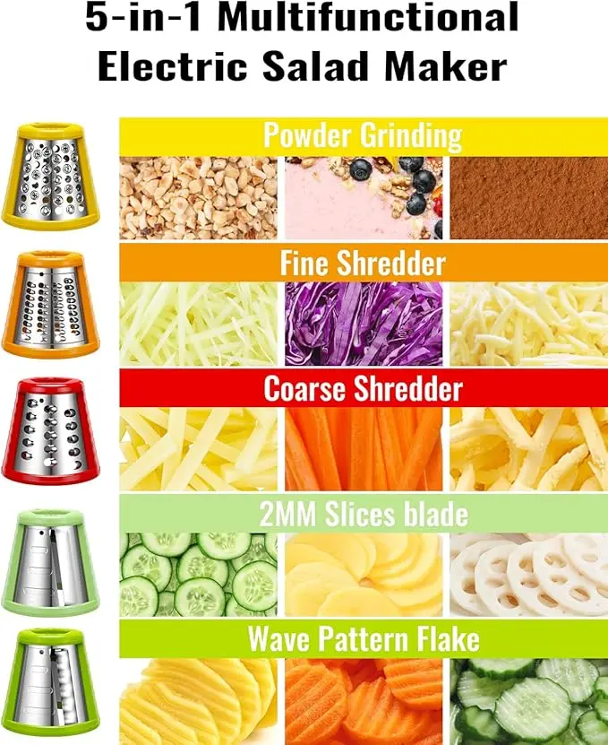 【5-in-1 Multi-Functional Cheese Salad Maker】This professional salad maker is equipped with five interchangeable stainless steel cones, including coarse line blade, fine line blade, slicing blade, wavy blade and grating blade, which can satisfy your cutting needs for different ingredients, and easily create diverse salads.