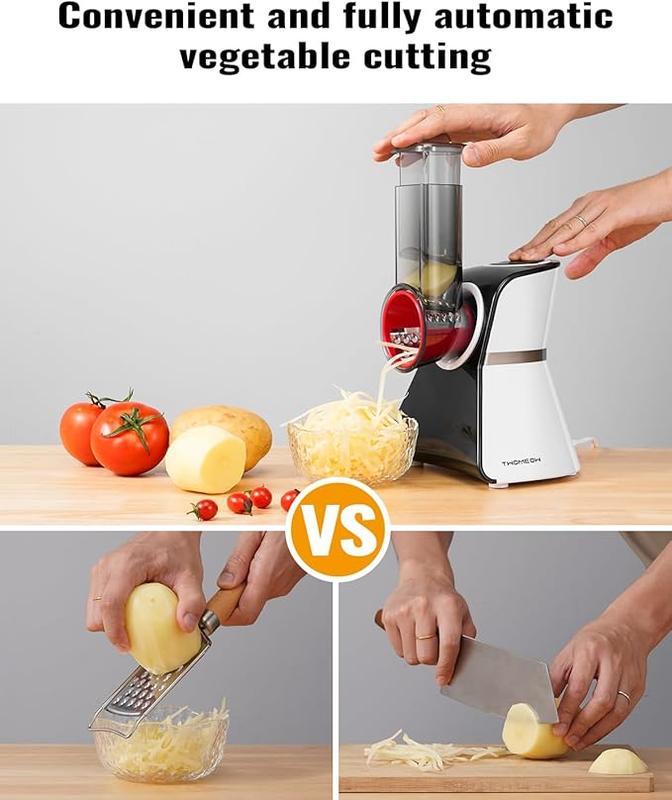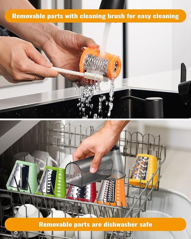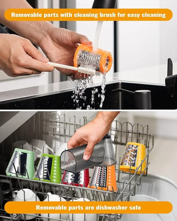 [EASY TO CLEAN, DISASSEMBLY] A cleaning brush is included, simply remove the blades and inlet for cleaning, the removable attachments are all dishwasher safe and can be cleaned directly without annoying cleaning steps. The base of the cheese grater can simply be wiped with a damp cloth, do not put it under water.