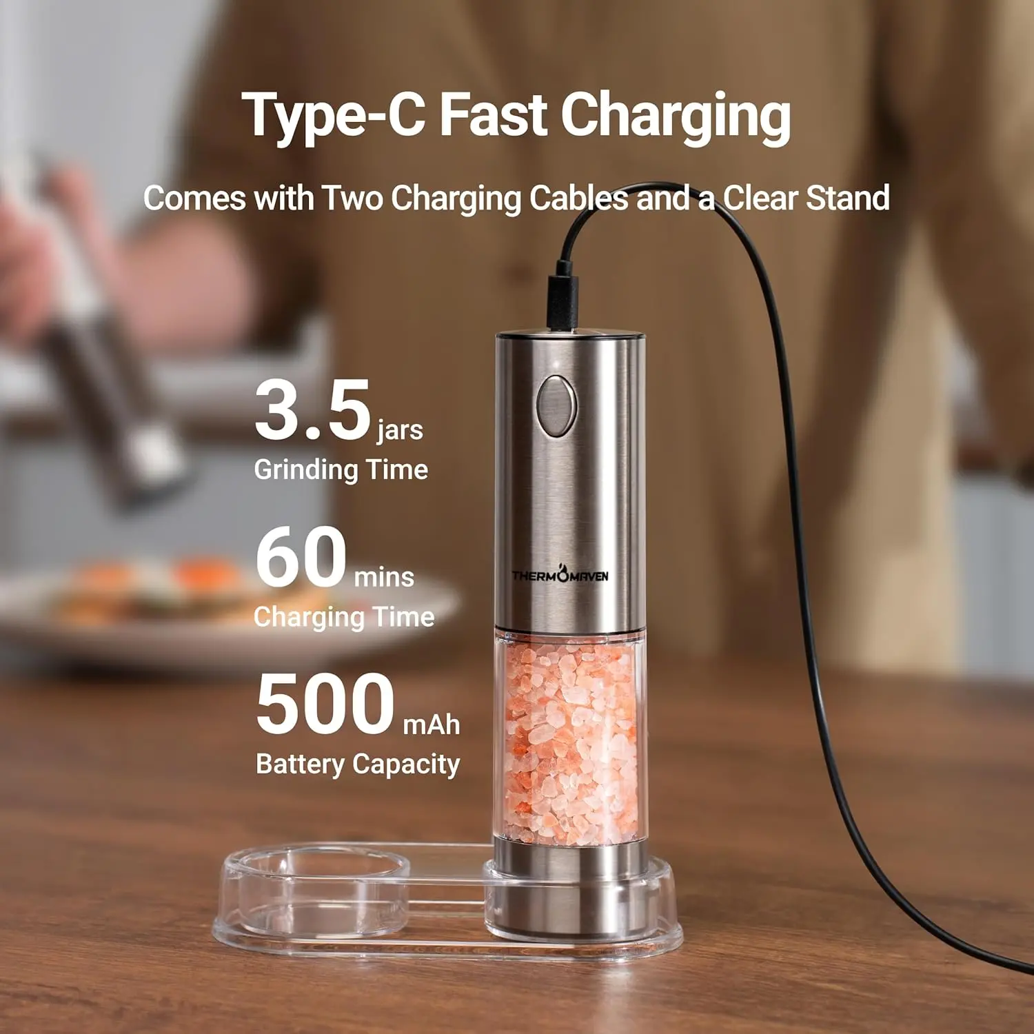 Our ThermoMaven rechargeable salt and pepper grinder set features two Type-C charging cables for quick and convenient charging. With just one charge, it can be used for daily purposes for approximately a month, contributing to a greener environment while saving you money by eliminating disposable batteries.