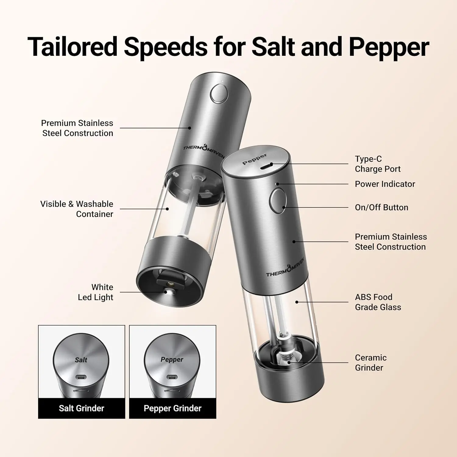 The ThermoMaven automatic salt and pepper grinder set offers a customizable grind with its high-hardness ceramic grinder for maximum flavor retention and intense aromas. With 6 different coarseness levels, achieve the perfect consistency for your dishes. Plus, our grinder is scientifically designed with different speeds for pepper and salt, enhancing the flavor of every meal.