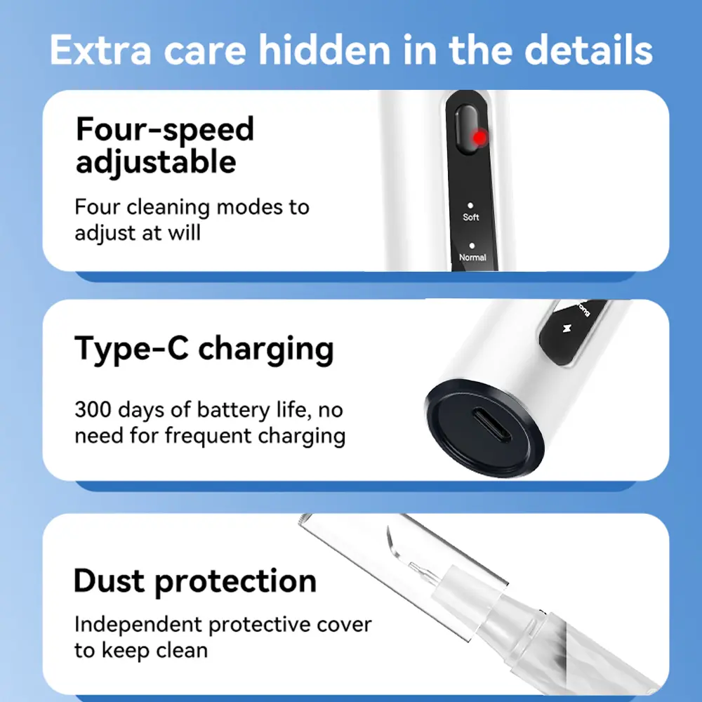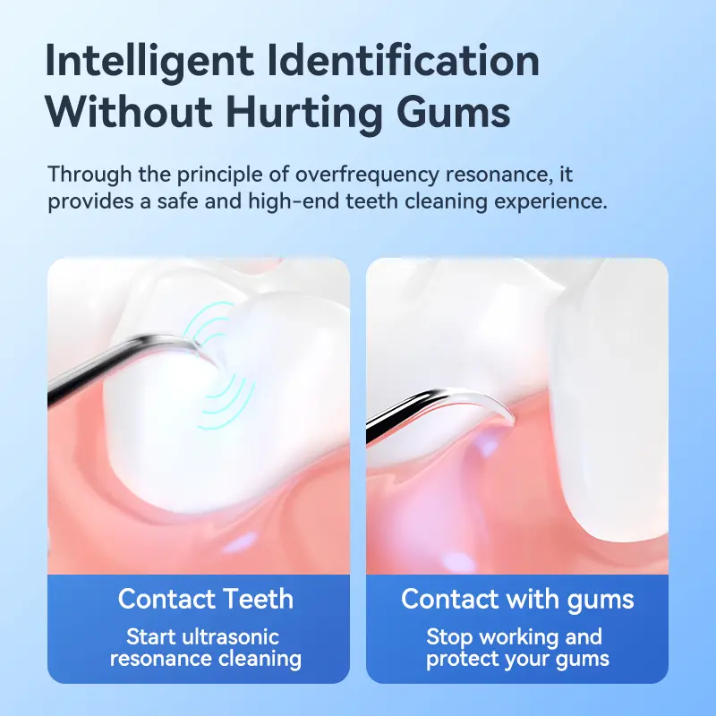Works only on teeth, stops on gums. No pain, beginner-friendly.