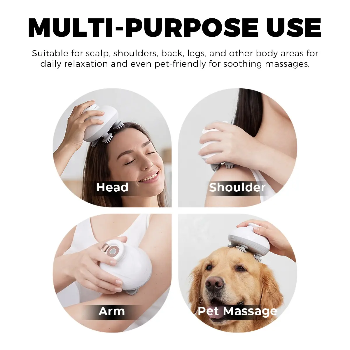 Relax your scalp anytime with the Electric Scalp Massager. Featuring 4 silicone heads with 96 massage nodes, it delivers a deep, comfortable kneading massage that helps improve circulation and relieve tension. Waterproof for wet or dry use, it’s perfect for the shower, home, travel, or even pampering your pets. With one-button control, 3 speed levels, rechargeable battery, and auto-off protection, it offers effortless relaxation wherever you go.