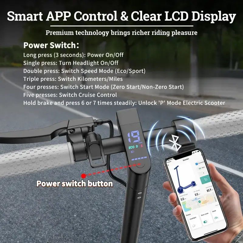 app,speed/battery/mileage display,APP lock for scooter,light switch ,scooter switch off,cruise on/off ,scooter speed zero &non-zero start,automatic shut down time setting