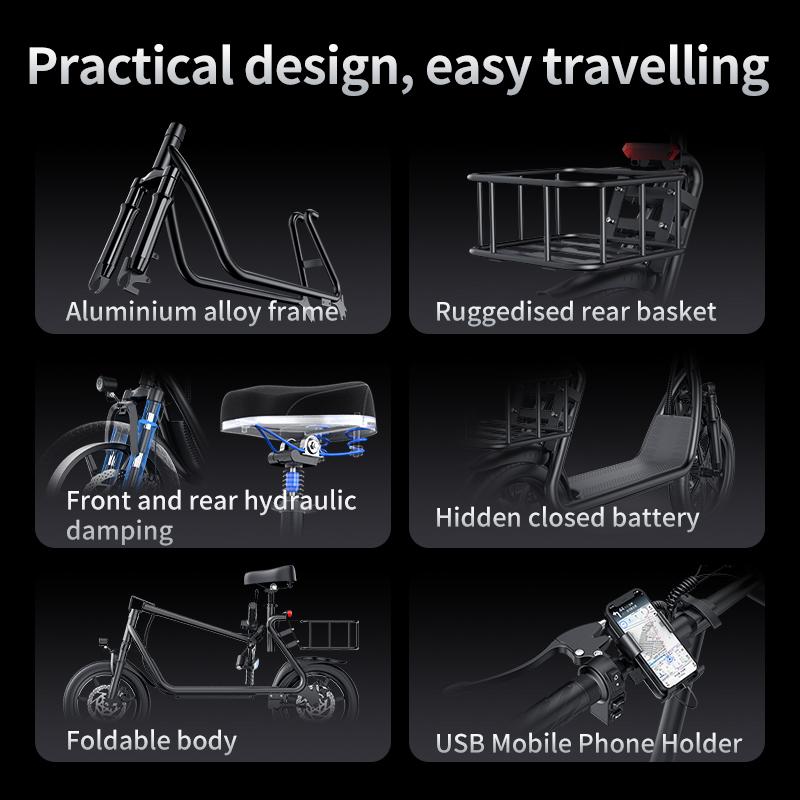 Characteristics: Up to 22 mph (faster on downhills), good brakes, headlights, taillights, basket